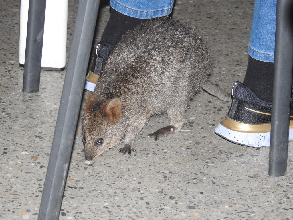 Quokkas are out everywhere as we walk back in the twilight. The baby quokkas are especially cute & are also plentiful. We stop at the Rottnest Hotel for dinner & around our feet inside the hotel quokkas are foraging for food scraps. The couple we sat near last night at Isola also sit at the next table tonight & we end up chatting again until well after our meals are finished & most others have left. We walk back to the Samphire Resort with them, they are staying on the same floor as us & we say our farewells to them. We walked 12.7 kilometres today & our legs are telling us we need some rest. Another great day.
