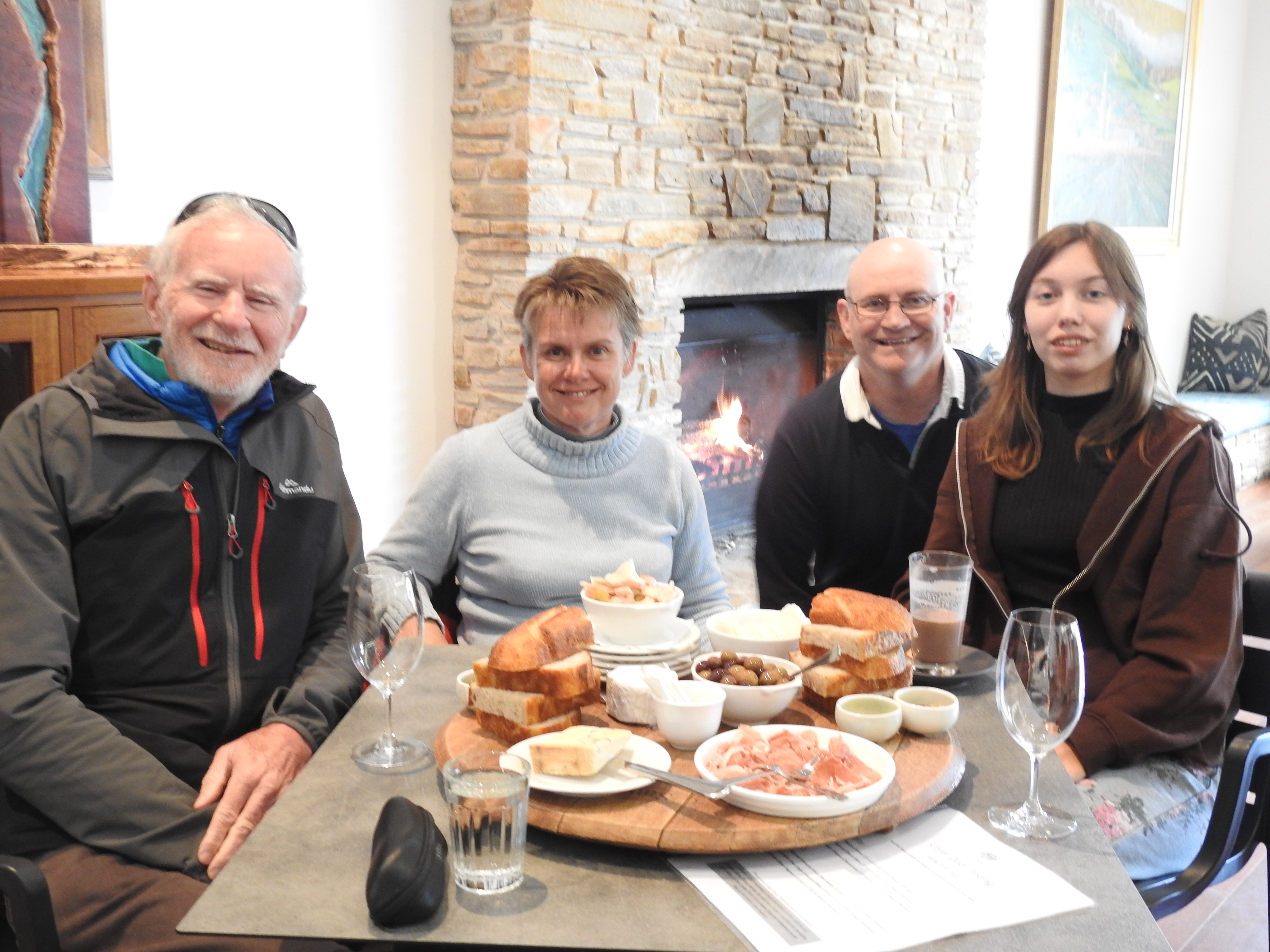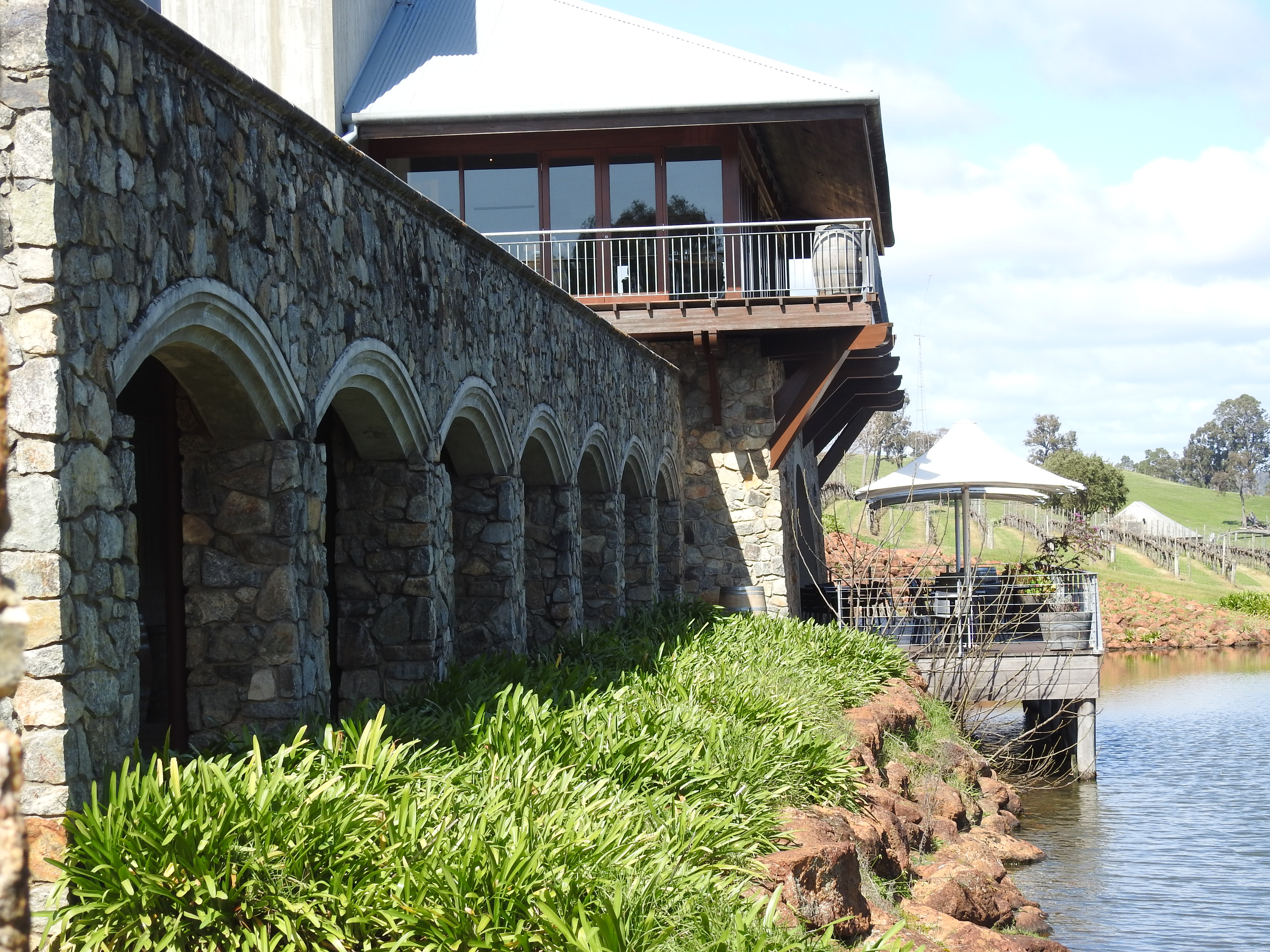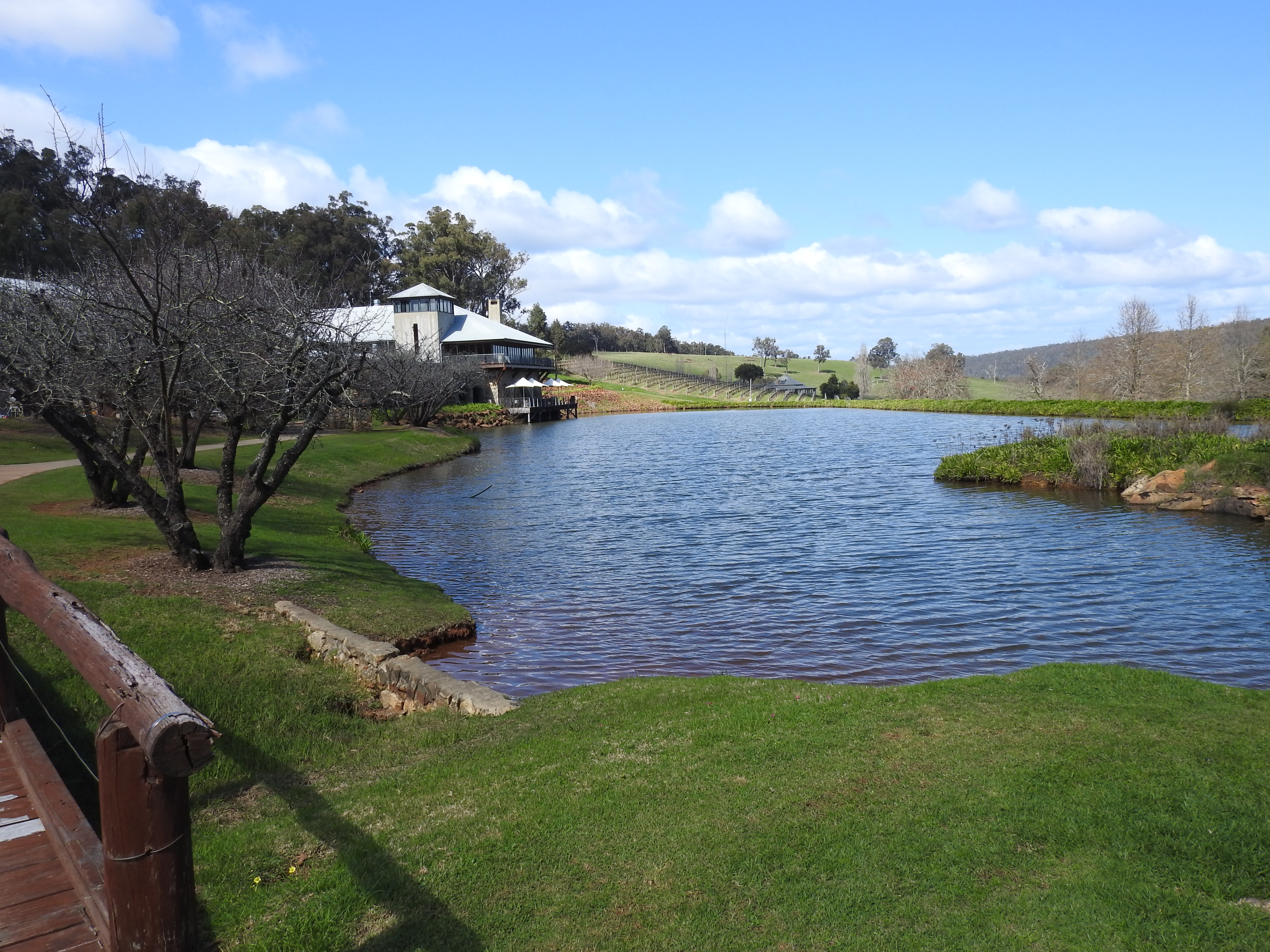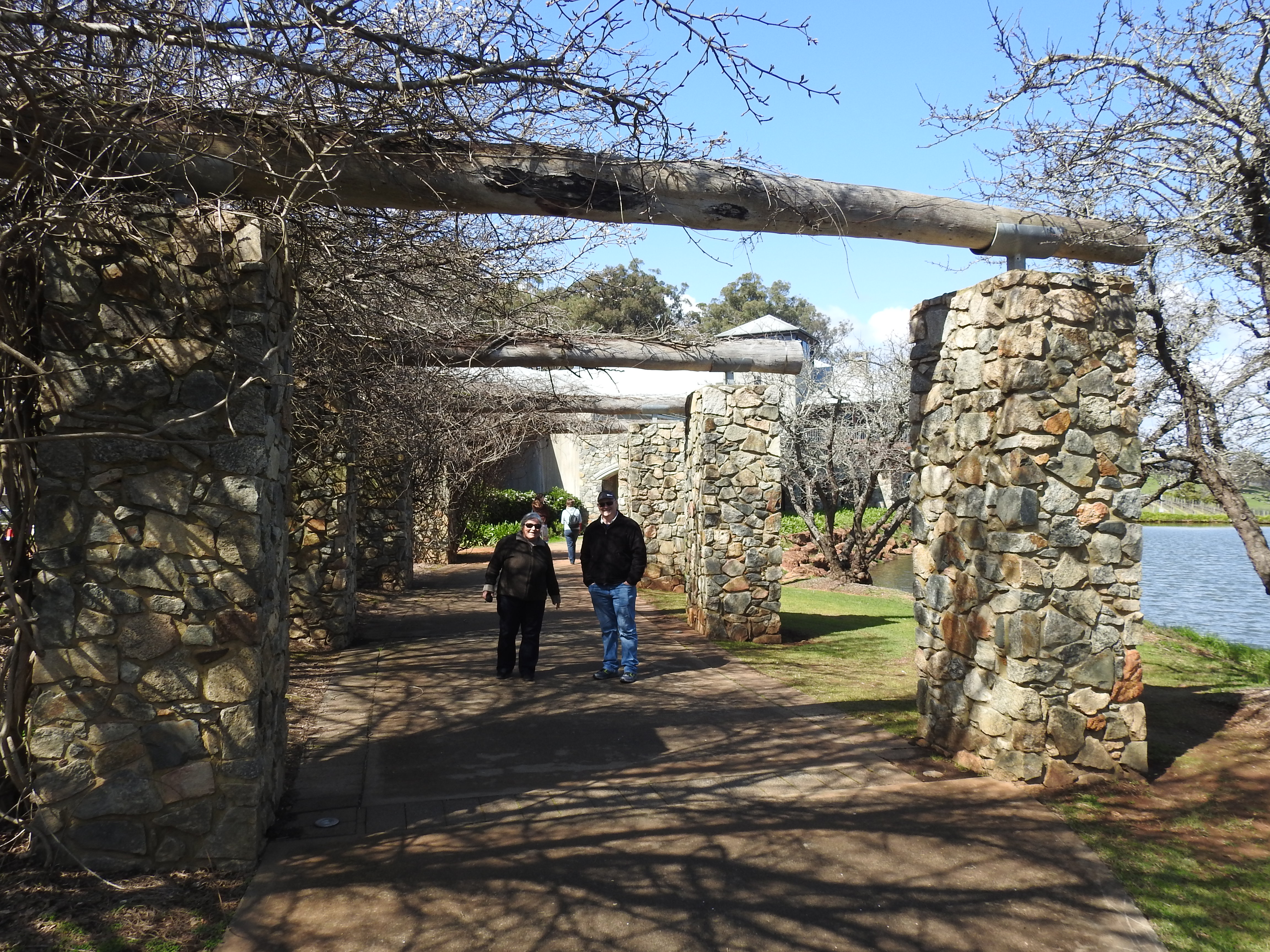 Denise cooked us a delicious pancake & fruit salad breakfast this morning & we sat & chatted for ages. Craig & I mounted a new weather station for Denise on the back fence then we had a leisurely morning tea. Denise then drove us back out to Jarrahdale & the Millbrook Winery. The beautiful Serpentine Forest, full of grass trees & tall eucalypts adjoins the Old Chestnut Lane as we drive down to the newly established Millbrook Winery. The building is big, new, stone & two storey overlooking a large dam with a small island hosting a statue of Dionysius, the Greek god of wine. The large tasting room has a very high ceiling, a long wooden bar & a roaring open fire & we fortunately find a vacant table near the fire. We order a large tasting platter full of delicious cheeses, olives, meat, bread & pickled vegetables. Plus some tasting glasses. We spend an enjoyable afternoon savouring the delicious cheeses, eating food, chatting & tasting some delicious wines. We purchase some of the best wines for our dinner tonight.