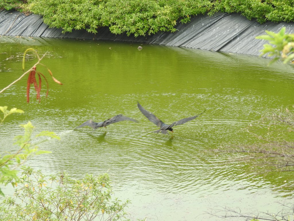 The Hidden Garden is next & has a fresh water dam & is the most popular place in the world for Frigate birds to have a drink of freshwater, according to Dave. Apparently the frigate birds have evolved for long distance flight & have no salt glands, so they have to drink fresh water. The dam is a hive of activity with all three species of the Frigate birds found on Christmas Island coming in for a drink. They swoop low then dip their beaks in to scoop up the water, we counted one of the frigate birds coming in for five drinks. They are very graceful in flight & amazingly manoeuvrable for such a large wingspan. There is a chookpen nearby with lots of chooks roaming around, one has a nest on the ground with about 15 eggs in it.
