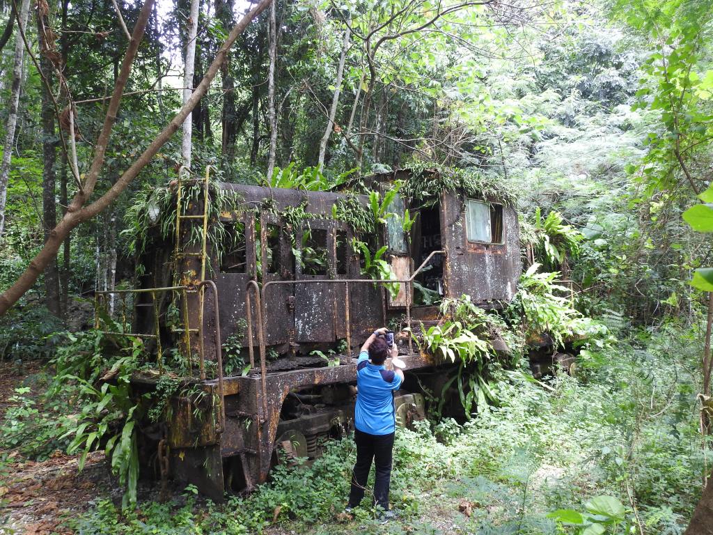 At the Crab Bridge we walk a small bit into the jungle edging the road & spot an old railway locomotive that has been left abandoned to rot in the jungle. It is amazing how the jungle is starting to overtake it. One of our guides told us that his brother worked on repairing that locomotive as it was damaged in a fire & he used the parts from two old locomotives to build this one in Perth, then it was shipped to the island to be used hauling phosphate from the mine to the processing plant.