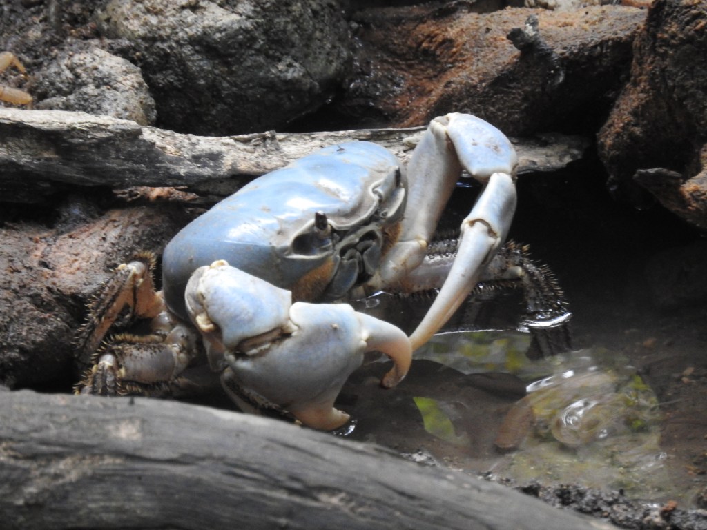 The Dales is a series of seven freshwater streams along the coast flowing into the ocean. It is crab central, with lots of red, blue & robber crabs, including lots of baby crabs in the freshwater streams. We take the walking track to Hughes Dale Waterfall, a gentle boardwalk through the stunning rainforest with lots & lots of steps & near the end some very steep steps. It is fairly humid under the canopy & we break out a sweat. The fresh water in the creeks has flowed through many layers of limestone & as it drops over the waterfall some of the calcium stays behind, hardens back to stone & forms a tufa flow down the creek bed. It looks just as if someone had poured cement along the creek bed. Dave tells us that this tufa is a living organism. One of our group has a shower under the waterfall. The walk out is mostly downhill & we see even more crabs of all sizes & variety, our eyes are becoming accustomed to picking them out amongst the tree roots & rocks lining the creek.