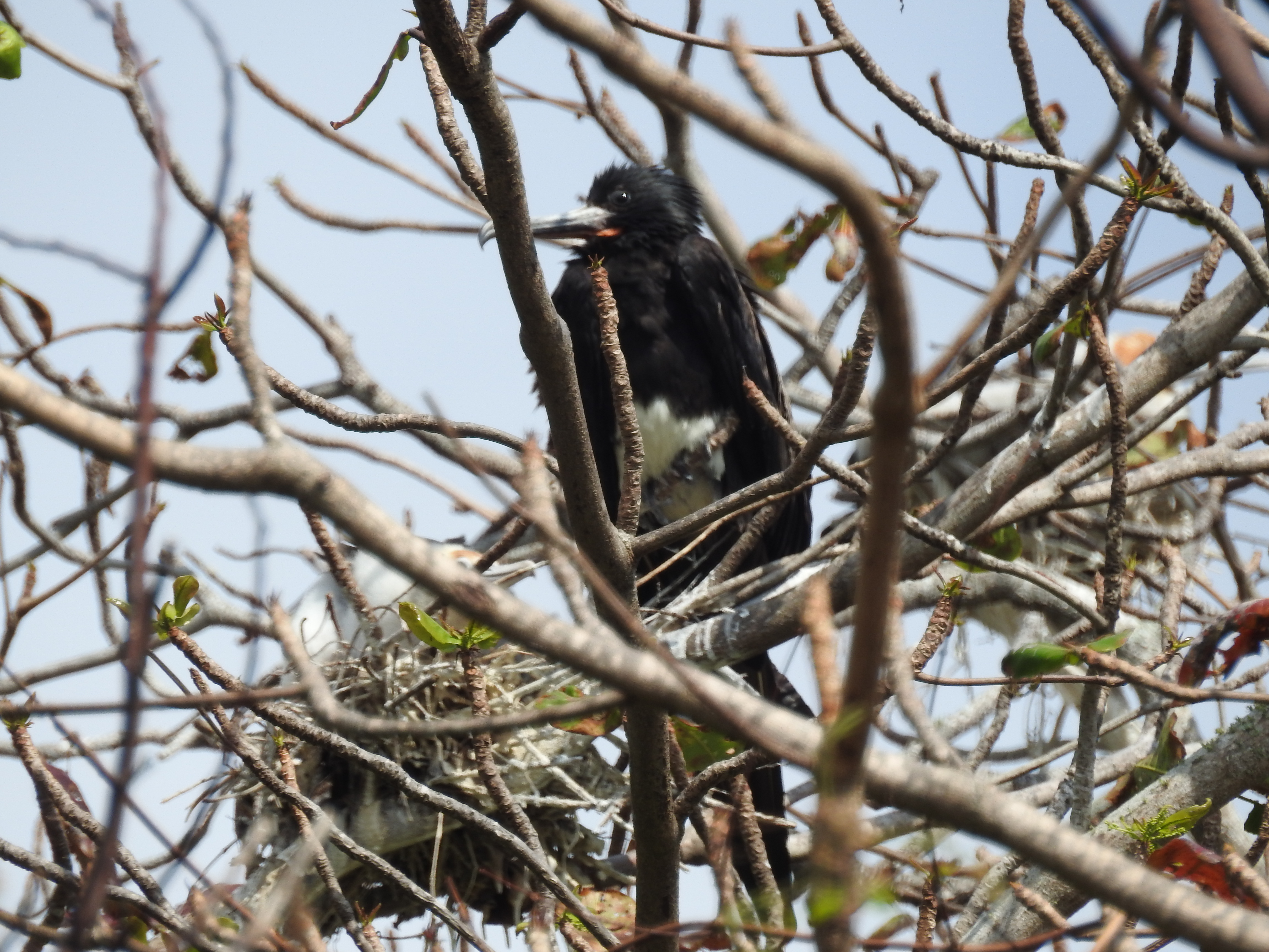 The Hidden Garden is next & has a fresh water dam & is the most popular place in the world for Frigate birds to have a drink of freshwater, according to Dave. Apparently the frigate birds have evolved for long distance flight & have no salt glands, so they have to drink fresh water. The dam is a hive of activity with all three species of the Frigate birds found on Christmas Island coming in for a drink. They swoop low then dip their beaks in to scoop up the water, we counted one of the frigate birds coming in for five drinks. They are very graceful in flight & amazingly manoeuvrable for such a large wingspan. There is a chookpen nearby with lots of chooks roaming around, one has a nest on the ground with about 15 eggs in it.