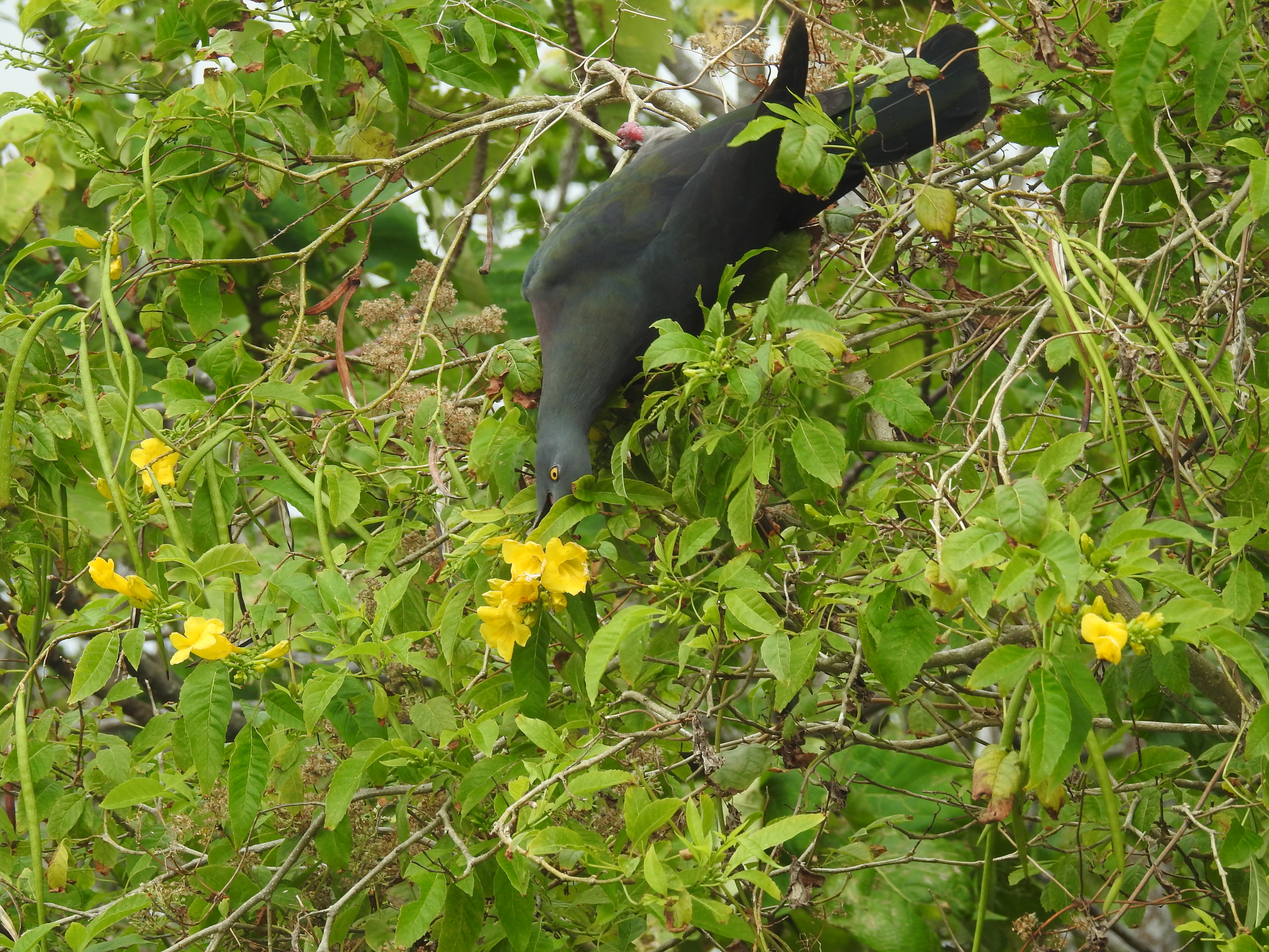 Our lunch is at Territory Day Park, this park is high on the cliff & has a stunning view over Flying Fish Cove, the wharf & mine buildings plus the Settlement. There are lots of Frigate birds & Bosun birds flying & gliding below & in front of us. We are very fortunate in seeing so many absolutely beautiful Golden Bosun birds, they are stunning with their golden sheen & long trailing tail streamers. The Territory Day Park is also stunning with the trees covered in epiphytes growing along the trunks & branches of the trees. The picnic lunch is delicious again with nice cold meats & fresh salads & we talk with a few more of our fellow birders.
