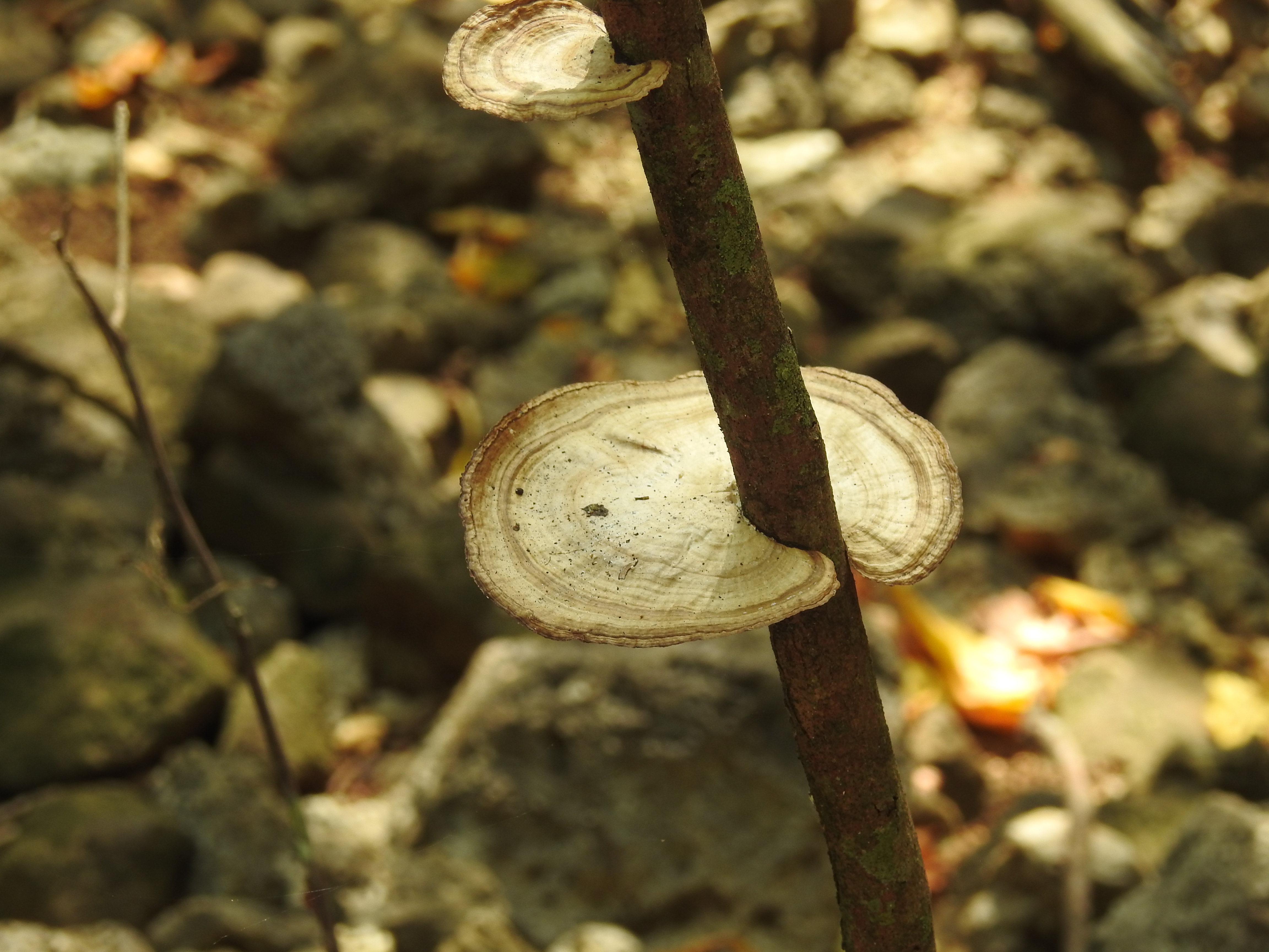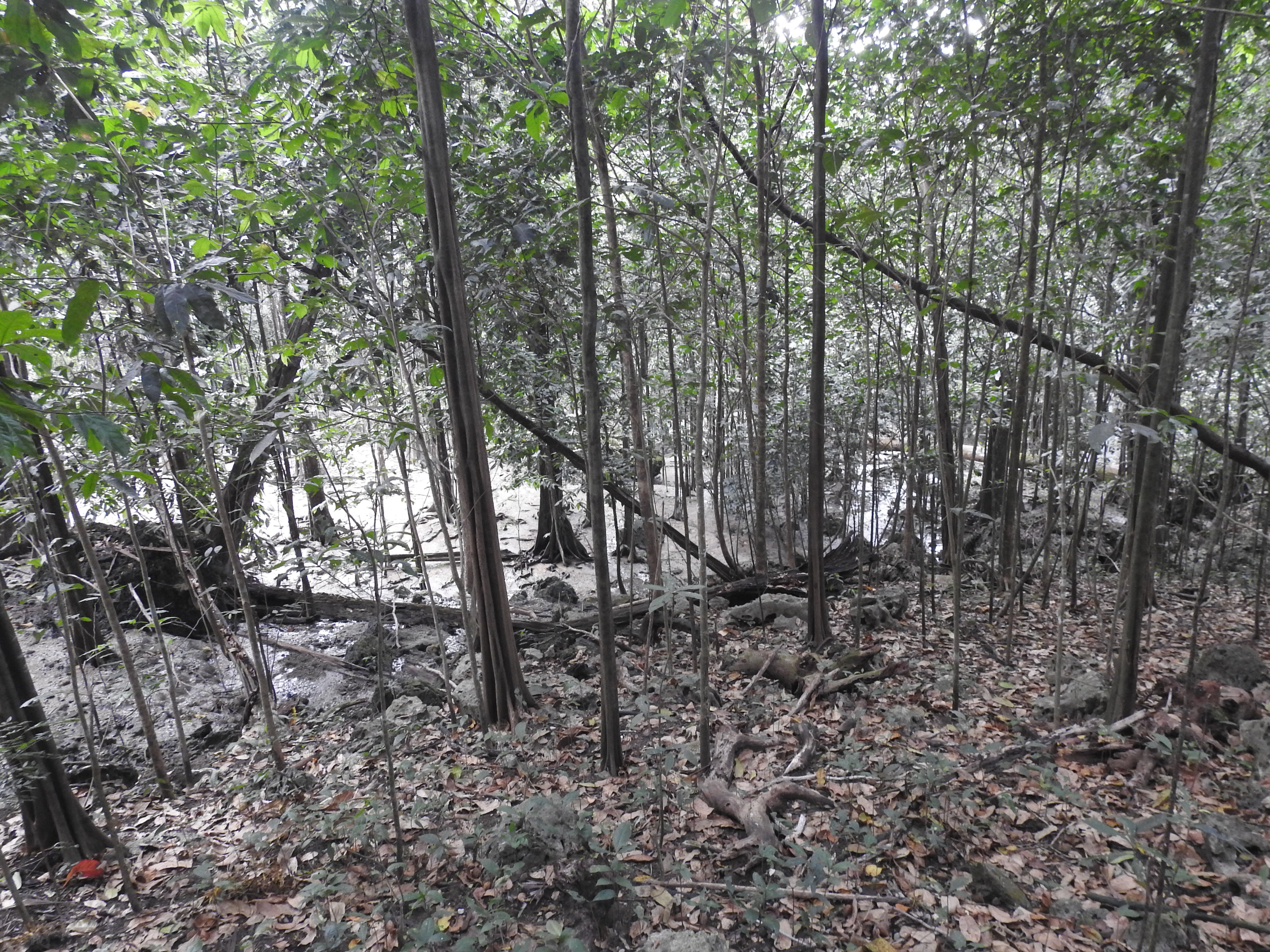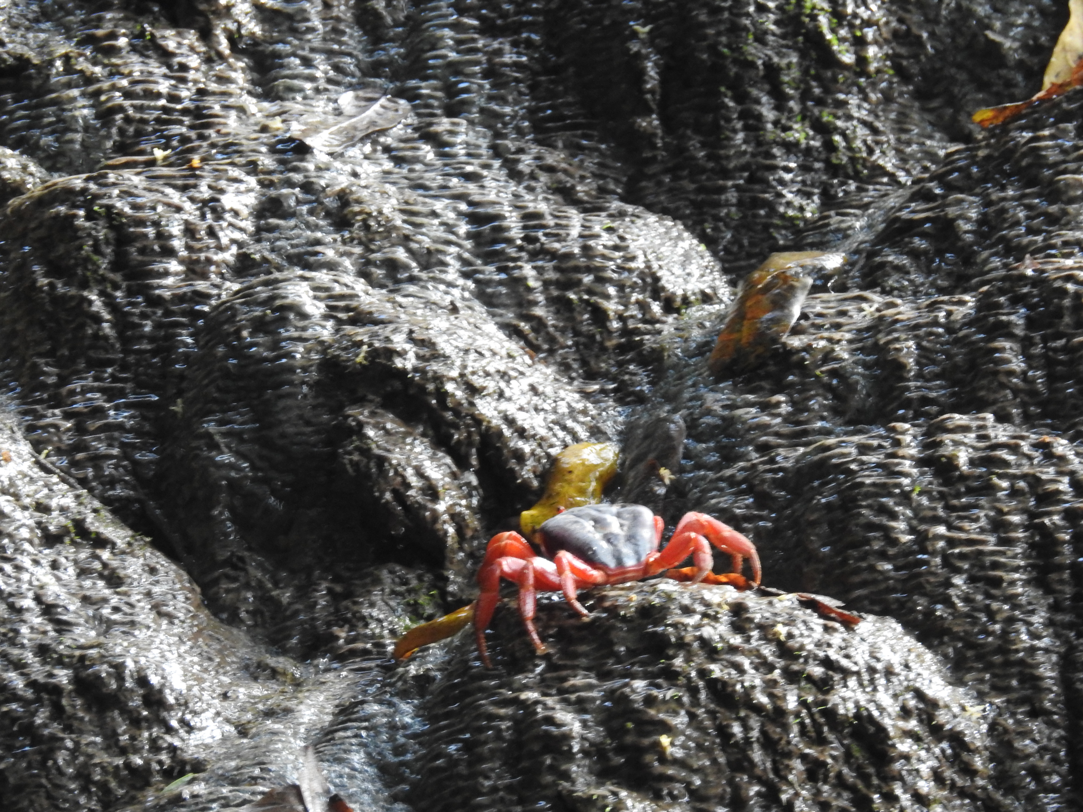 We then drive off down a narrow dirt track in the jungle through a canopy of lush rainforest. In one place we come into a sea of fishbone ferns, an old phosphate mine site that has not been rehabilitated & the weeds have taken over. There are giant pandanus trees with very long strappy leaves. We drop down off the escarpment down a long steep scree slope with the limestone formations changing as we get to the bottom. The forest vegetation looks amazing. All too soon we break back out onto the main road & stop at the Crab Bridge, designed so that the migrating red crabs can climb up & over the road. The edges of the road have high metal strips that guide the crabs along the roadside then over the bridge.