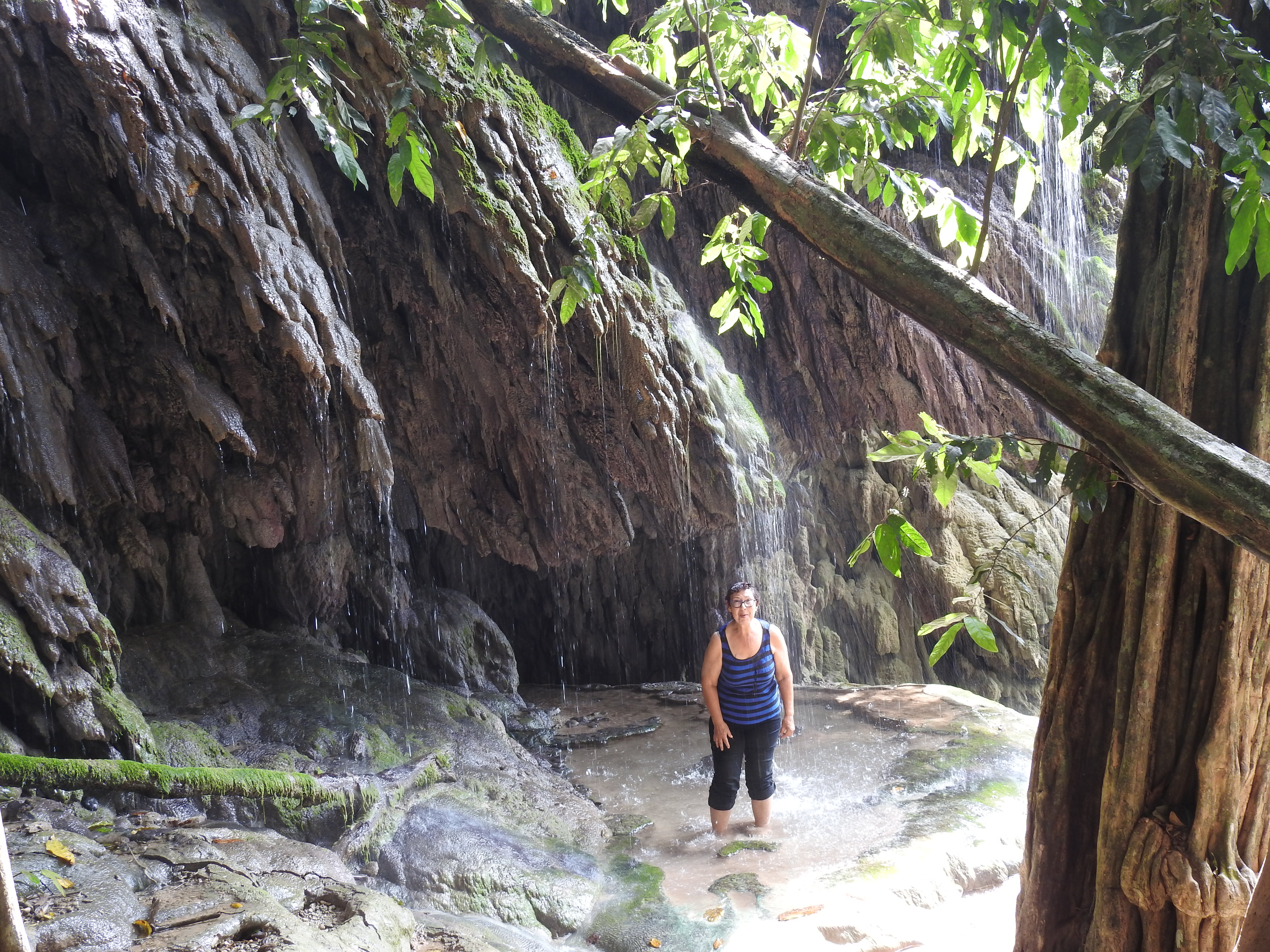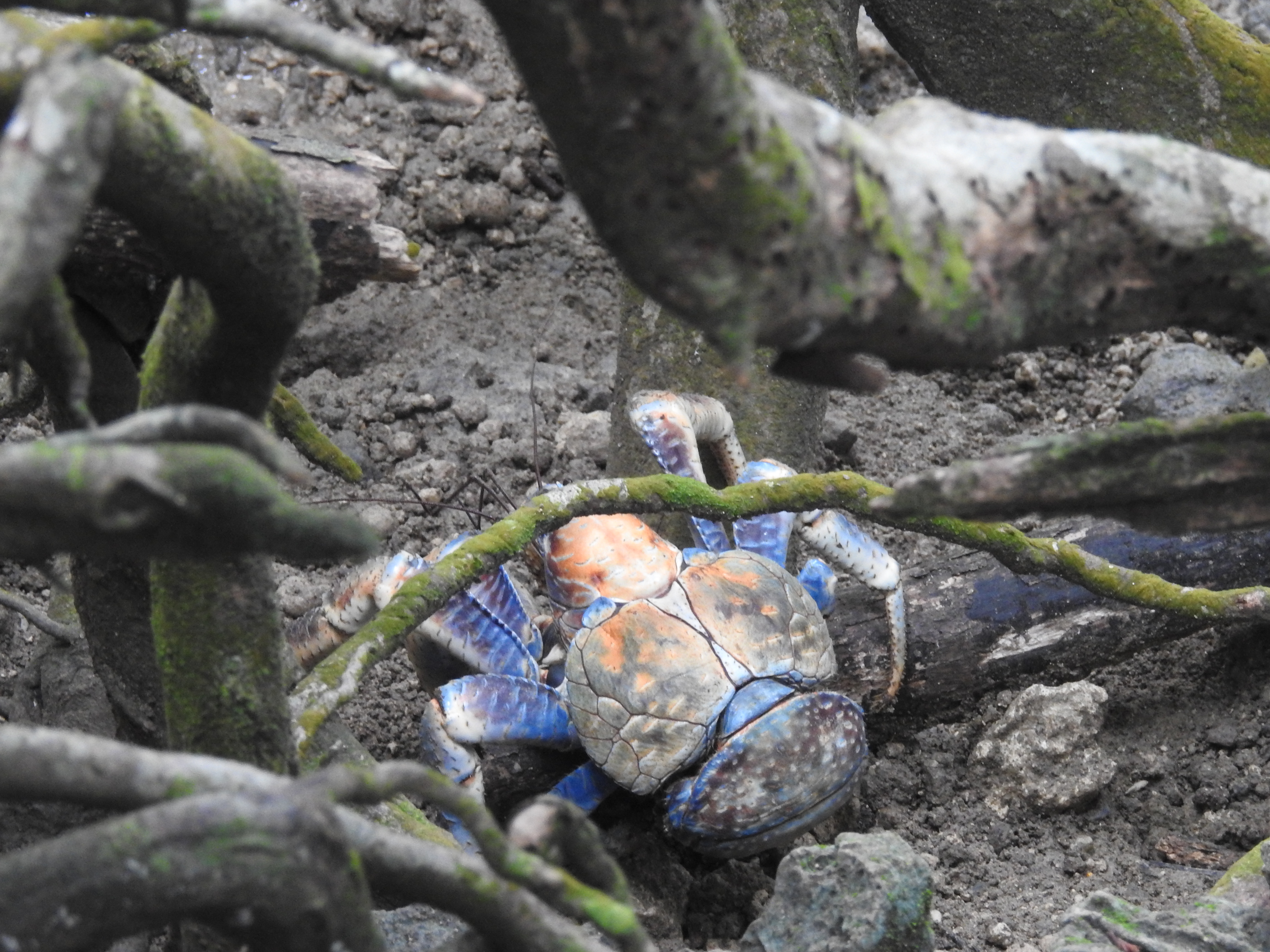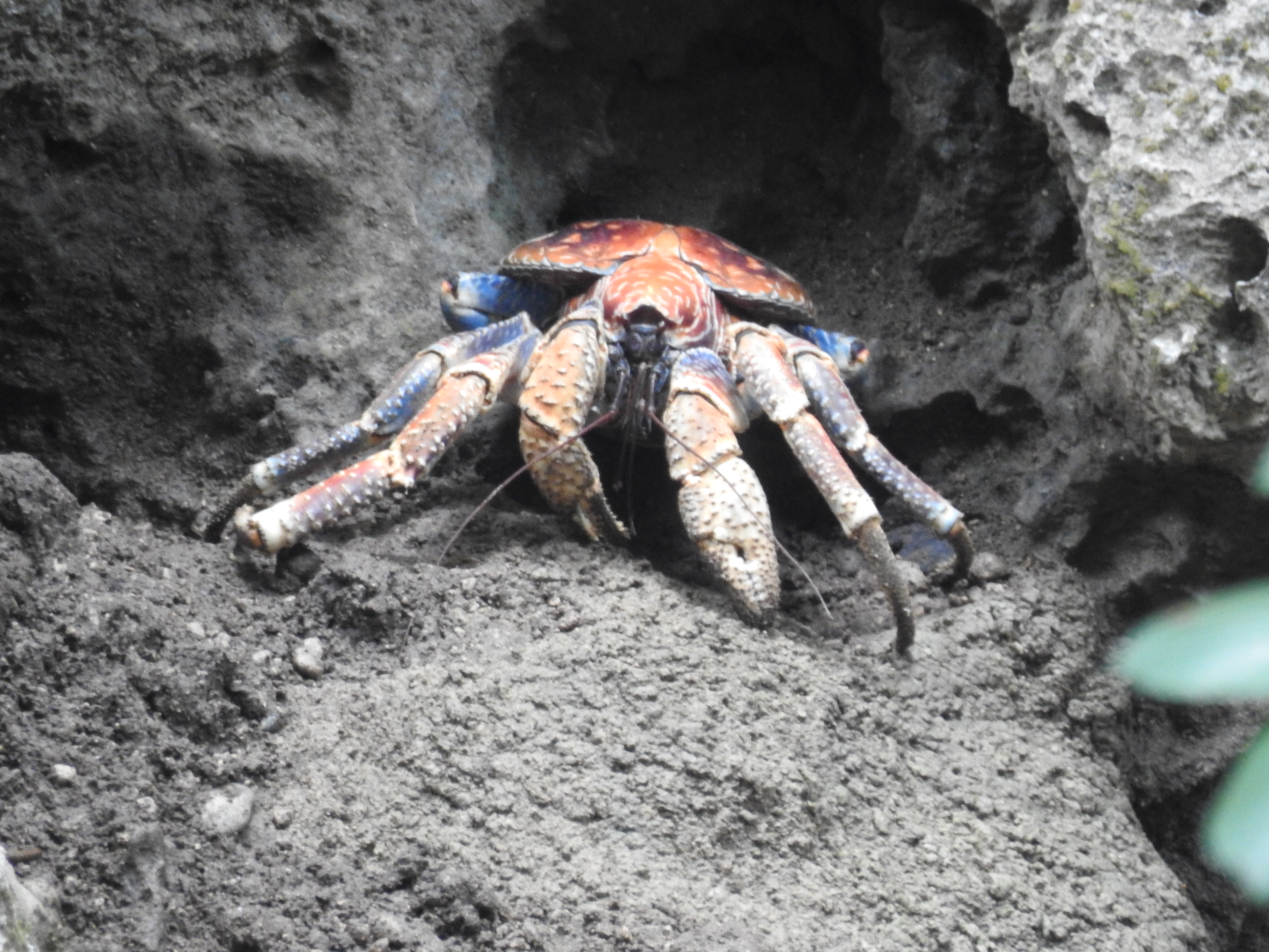 The Dales is a series of seven freshwater streams along the coast flowing into the ocean. It is crab central, with lots of red, blue & robber crabs, including lots of baby crabs in the freshwater streams. We take the walking track to Hughes Dale Waterfall, a gentle boardwalk through the stunning rainforest with lots & lots of steps & near the end some very steep steps. It is fairly humid under the canopy & we break out a sweat. The fresh water in the creeks has flowed through many layers of limestone & as it drops over the waterfall some of the calcium stays behind, hardens back to stone & forms a tufa flow down the creek bed. It looks just as if someone had poured cement along the creek bed. Dave tells us that this tufa is a living organism. One of our group has a shower under the waterfall. The walk out is mostly downhill & we see even more crabs of all sizes & variety, our eyes are becoming accustomed to picking them out amongst the tree roots & rocks lining the creek.