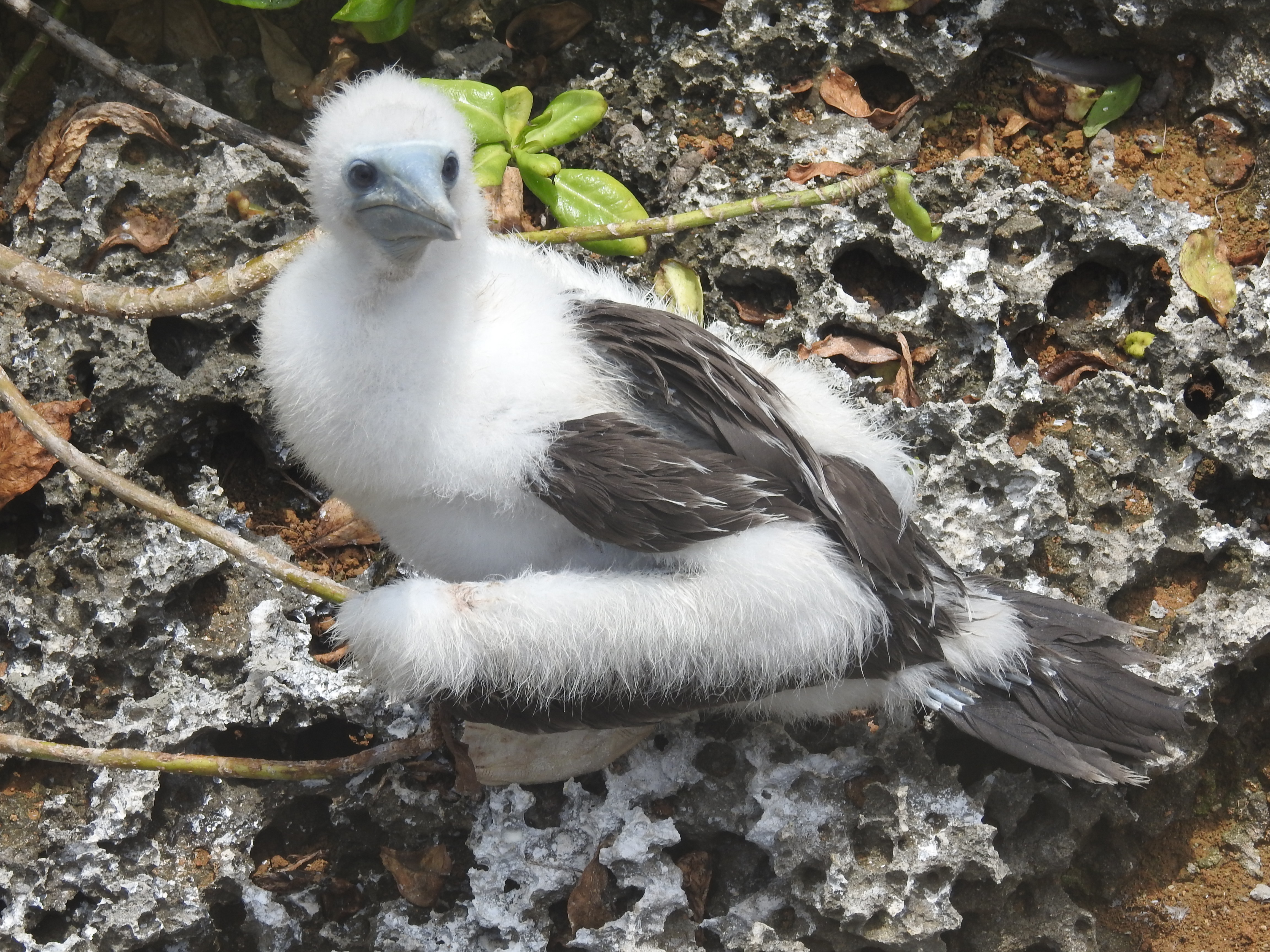 A little further along the road there are trees that have lots of the Abbotts Booby nesting & there are adults flying into the nests, feeding the chicks, then flying off again. These birds are magnificent in flight with a very long wingspan & they crash into the outer branches when landing, then walk their way along the branch to the nest. They have an unusual call, very loud & distinctive. The Abbotts Booby is very rare & is found only on Christmas Island with only around 3,000 breeding pairs. We are very privileged to see them.