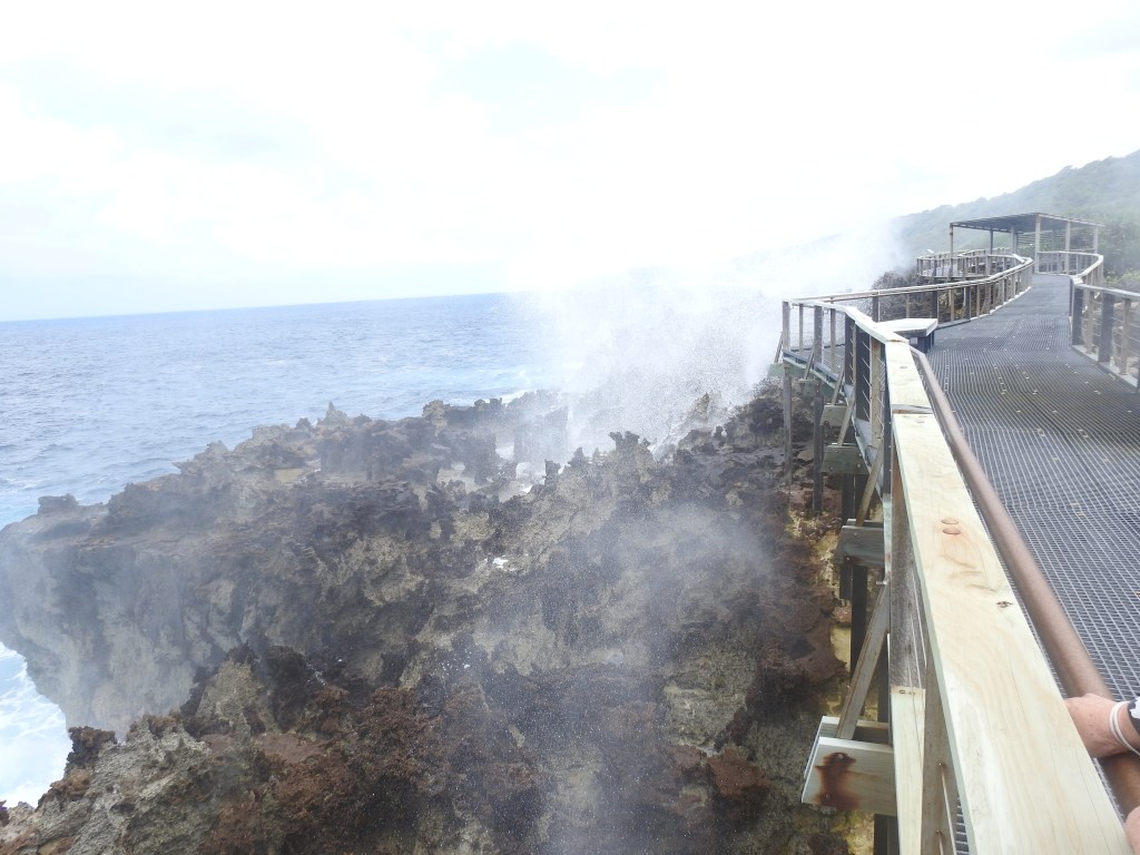 We drive next back to the Blowholes to see a Brown Booby chick that is next to the boardwalk. It is out sitting in plain sight, none of our group saw it the day before, we were obviously too engrossed with the amazing spectacle of the blowholes roaring & gushing seawater high into the air. We are now engrossed with the chick sitting on the bare rock, however, the lure of the roaring & gushing blowholes draws us back to enjoying them one more time, they are amazing.