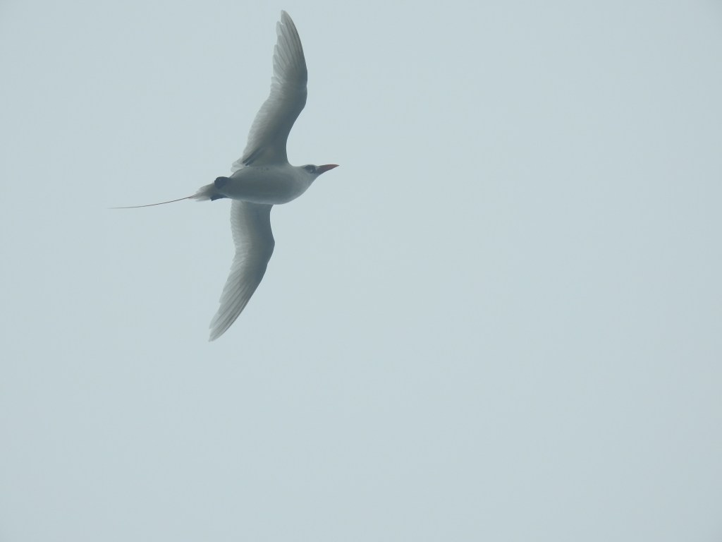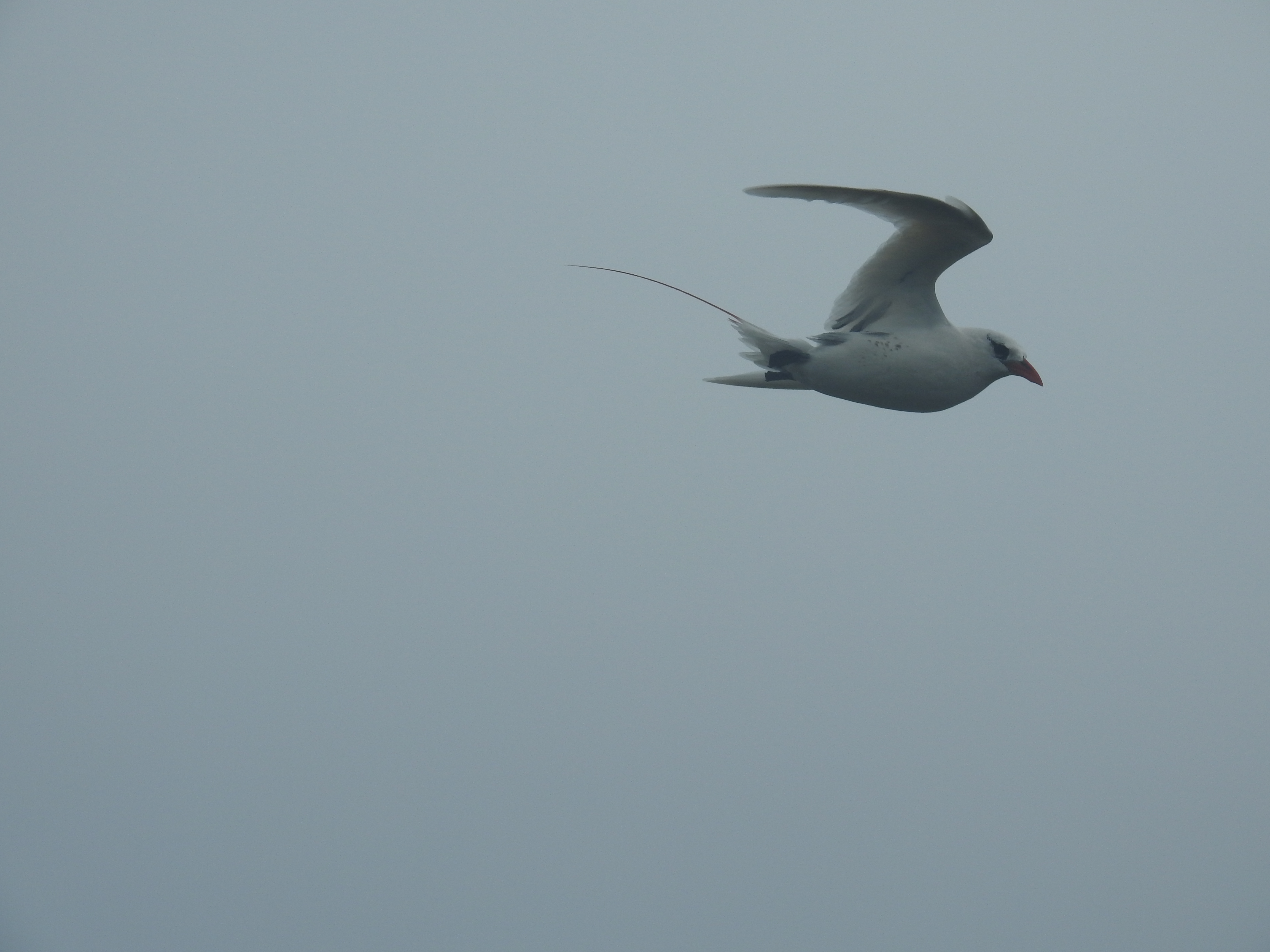 We drove nearly all the way into the Settlement to Phosphate Hill & stopped on Quarry Road. There is a very steep & treacherous track through the forest leading to the Golf Course Lookout. This track takes us through an old Chinese cemetery where the decayed old limestone headstones have all been replaced with new stone. After the cemetery the track becomes very steep & we have to be very careful walking. The golf Course Lookout is spectacular with stunning views south over the Golf Course. The spot has lots of seabirds flying past all the time heading back to nests to feed chicks. There is a constant procession of birds & we see all of the major seabirds, some of them getting very close to us. It is extremely windy & cool up here & cloud starts to come in, with birds that are flying higher disappearing into the clouds. We watch enthralled for ages before it is time to head back. The walk back up the track is strenuous with lots of rest stops on the way back up, it is hard work. The cloud is drifting across the road when we reach the bus & when we drive back past the airport the runway is not visible because of the thick cloud.