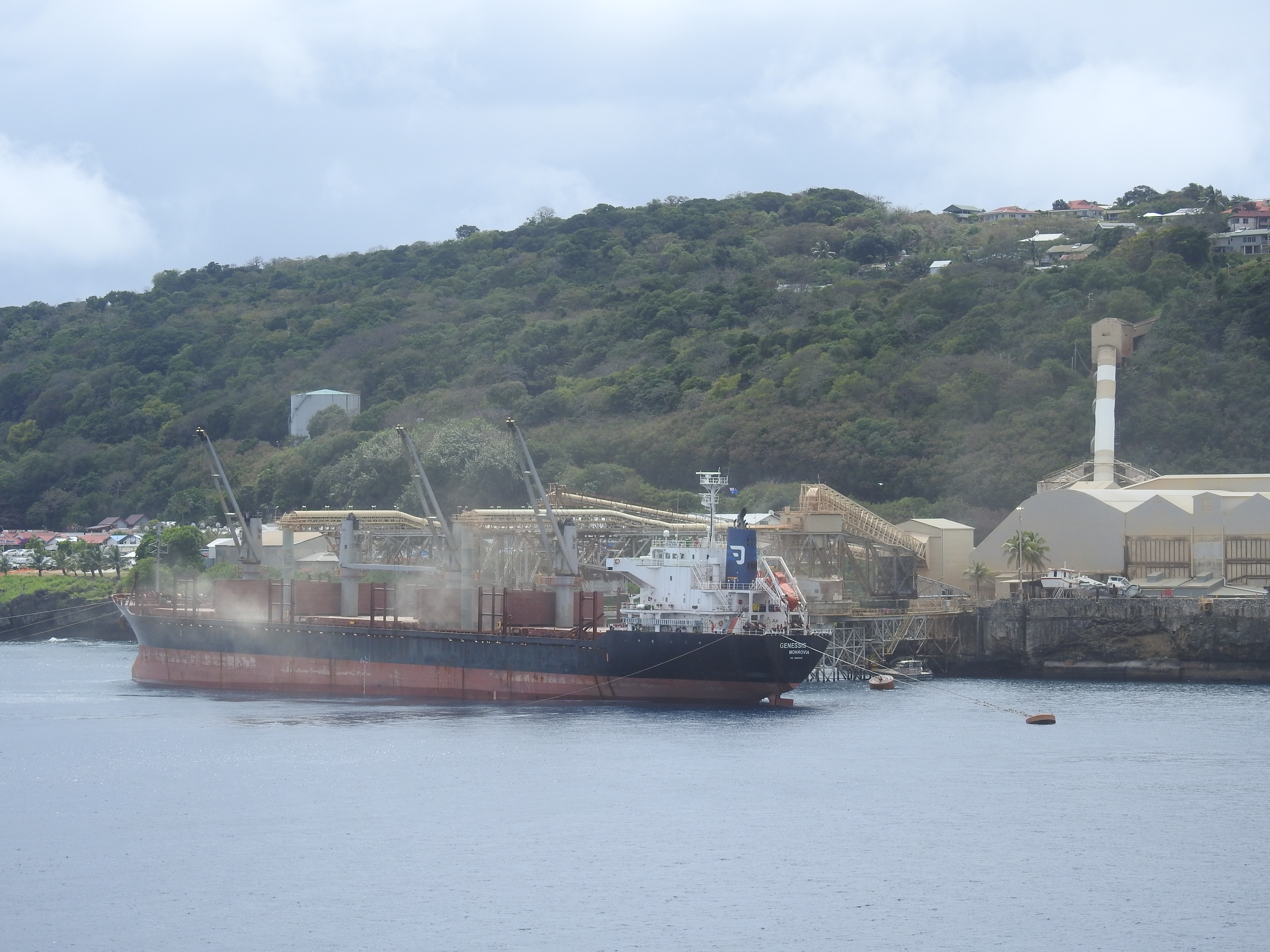 Our destination this morning is Tai Jin House again, this building is in good condition compared to the rest of the abodes on Christmas Island. This time the museum upstairs is open & we spend some time reading about the history of Christmas Island from its beginnings & viewing some of the artefacts collected over the years. It is all very interesting & sad how mainly Malaysian & Chinese labourers were treated, like slaves by their bosses. We finish by watching a video of both the island & the mining operations. This is pertinent as a ship has just come into port this morning & has begun loading phosphate with clouds of red phosphate dust billowing from the ship as the phosphate is loaded.