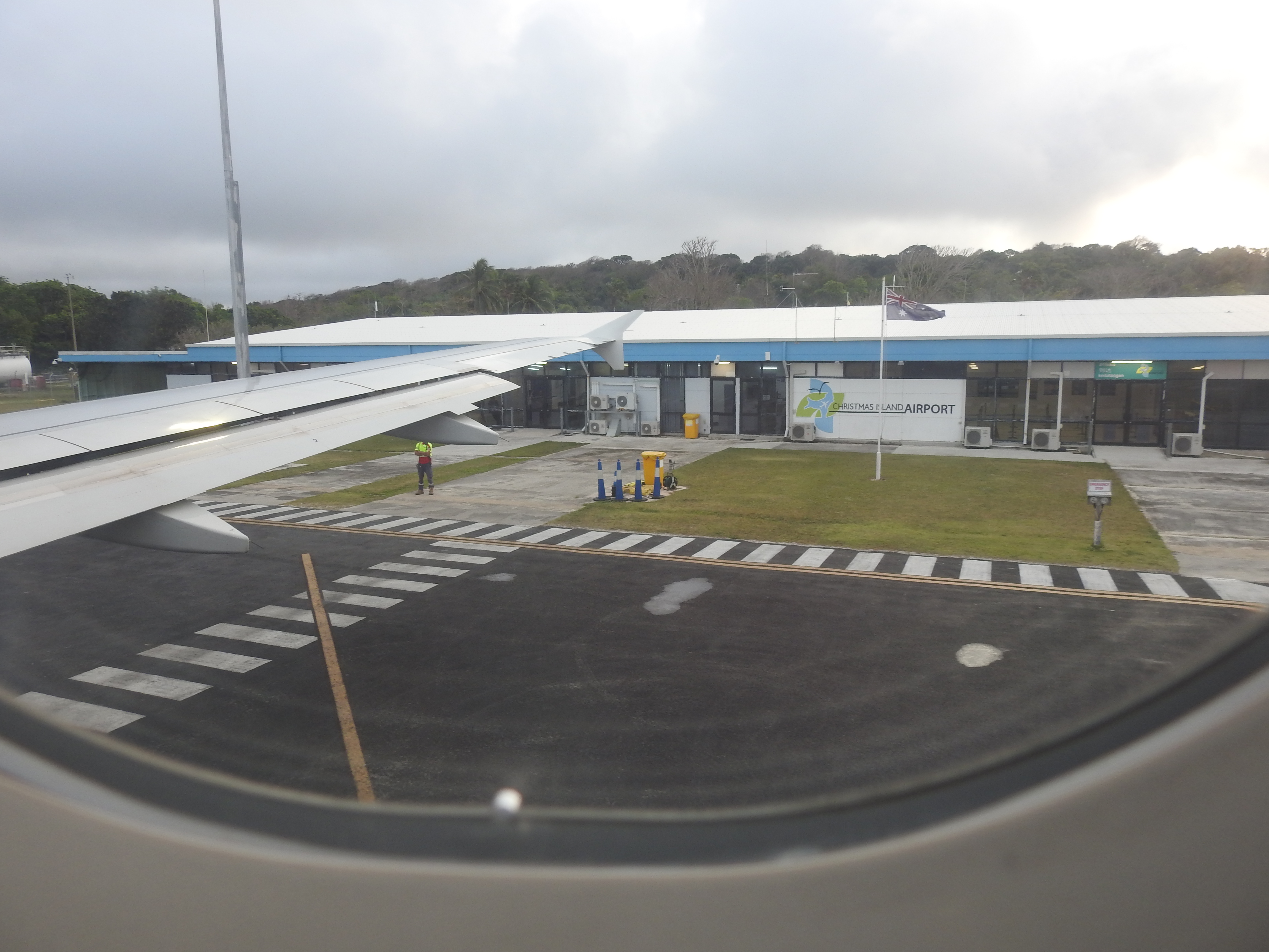 The flight to Cocos-Keeling Island is not full & the plane takes around 90 minutes to get there. The landing is a little bumpy as it is fairly windy on the island & the pilot stamps on the brakes as the runway is not that long. While in the plane Tereza manages to take a photo of “Christmas Island Airport” the sign that we were forbidden from photographing on our arrival. We taxi to the end of the runway then turn & taxi most of the way back up to the terminal.