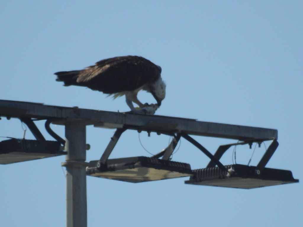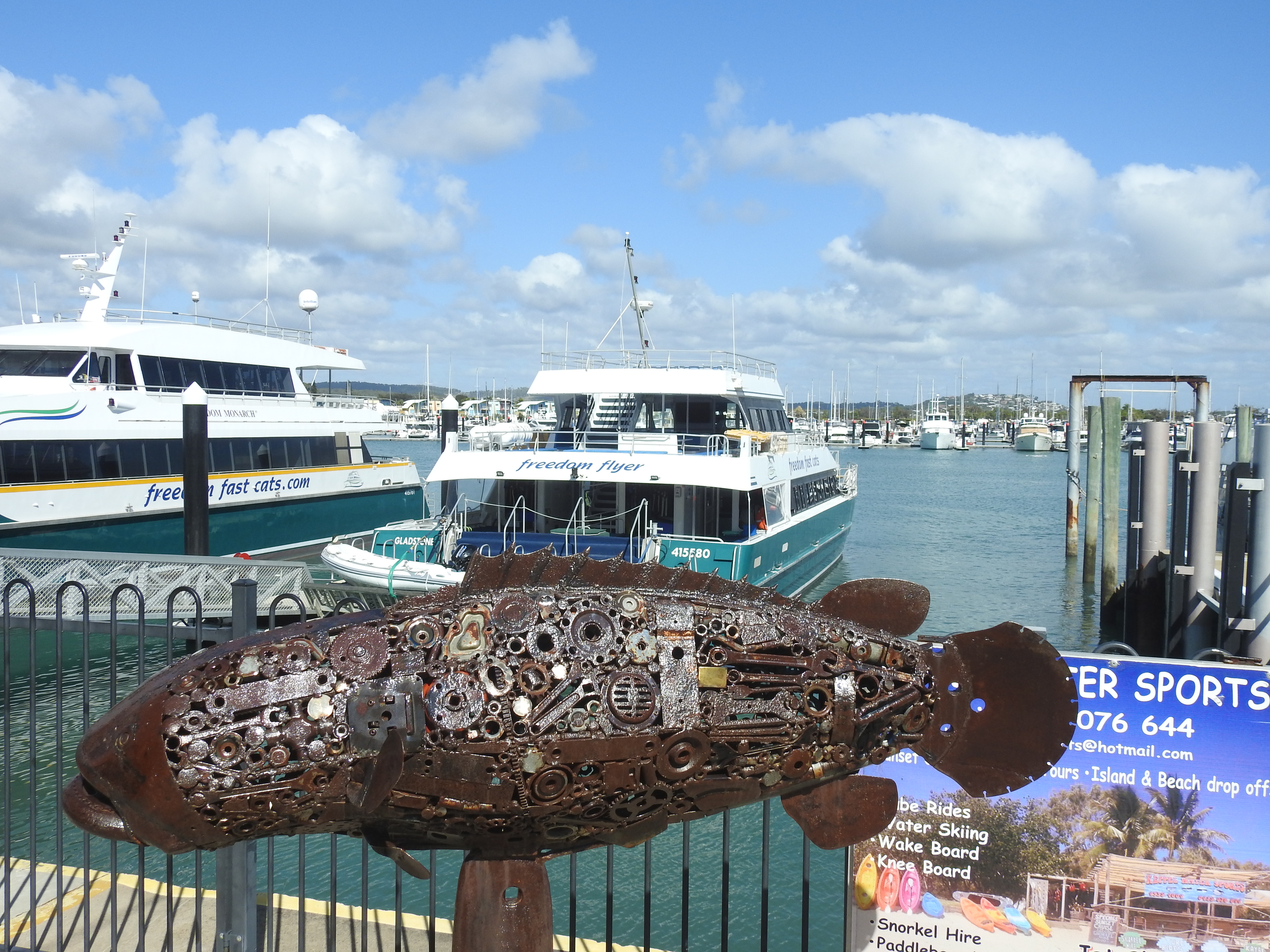 Away at 8.20 am this morning to the Keppel Bay boat harbour where we have booked an adventure cruise with Freedom Fast Cats. We check in at 8.30am & look around at the boats before we depart, there is a great cod sculpture on the wharf. There is a pair of Osprey nesting on a light pole in the car park, with one Osprey feeding on a fish on another light pole.