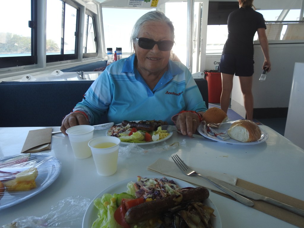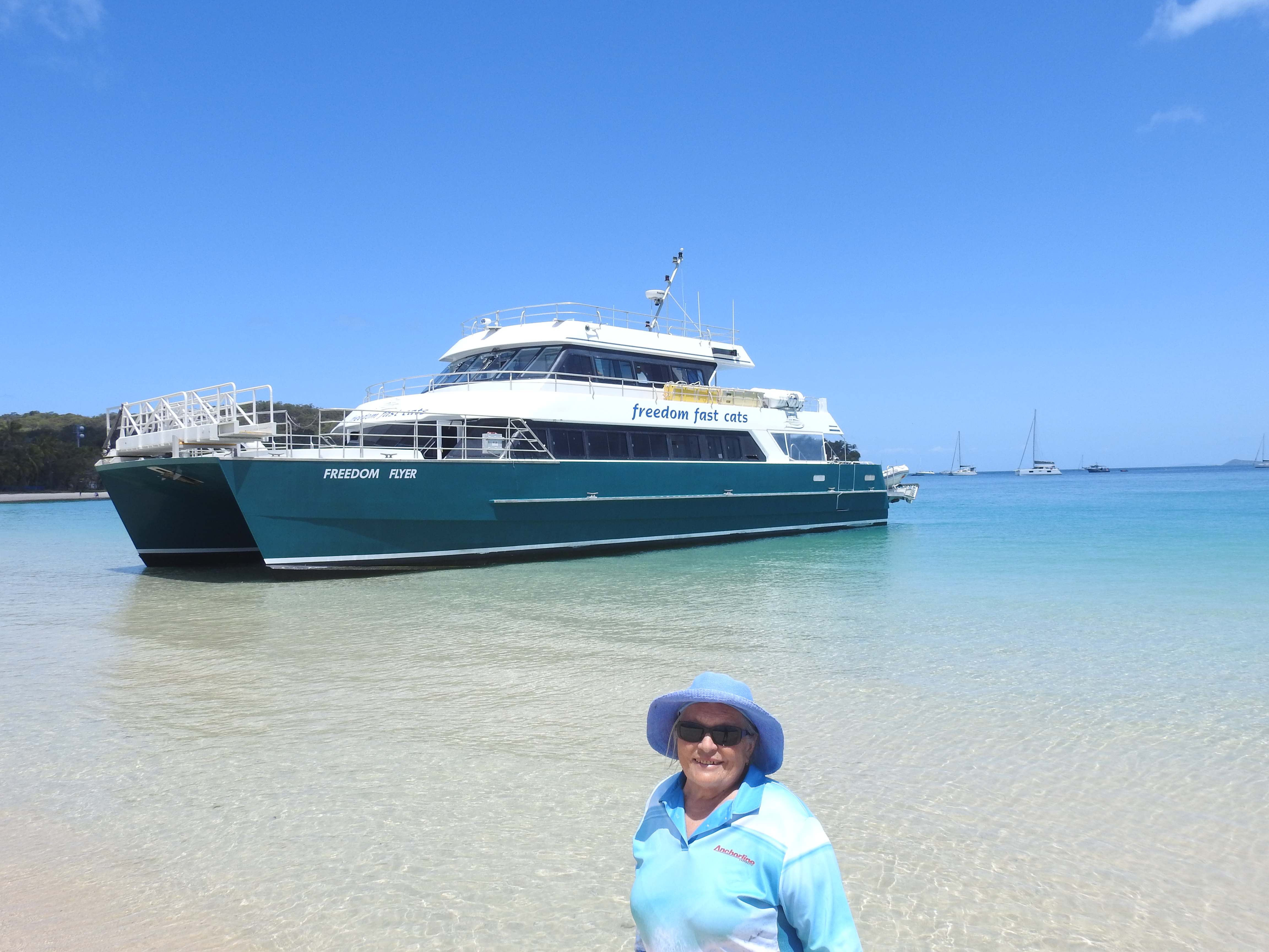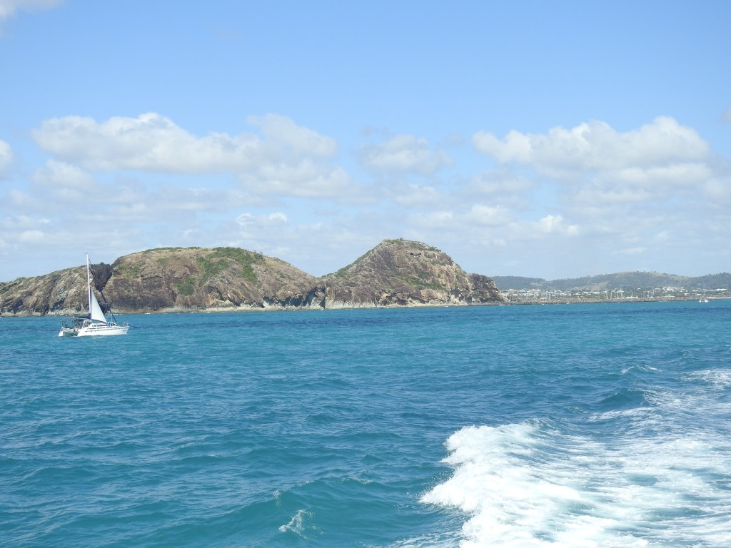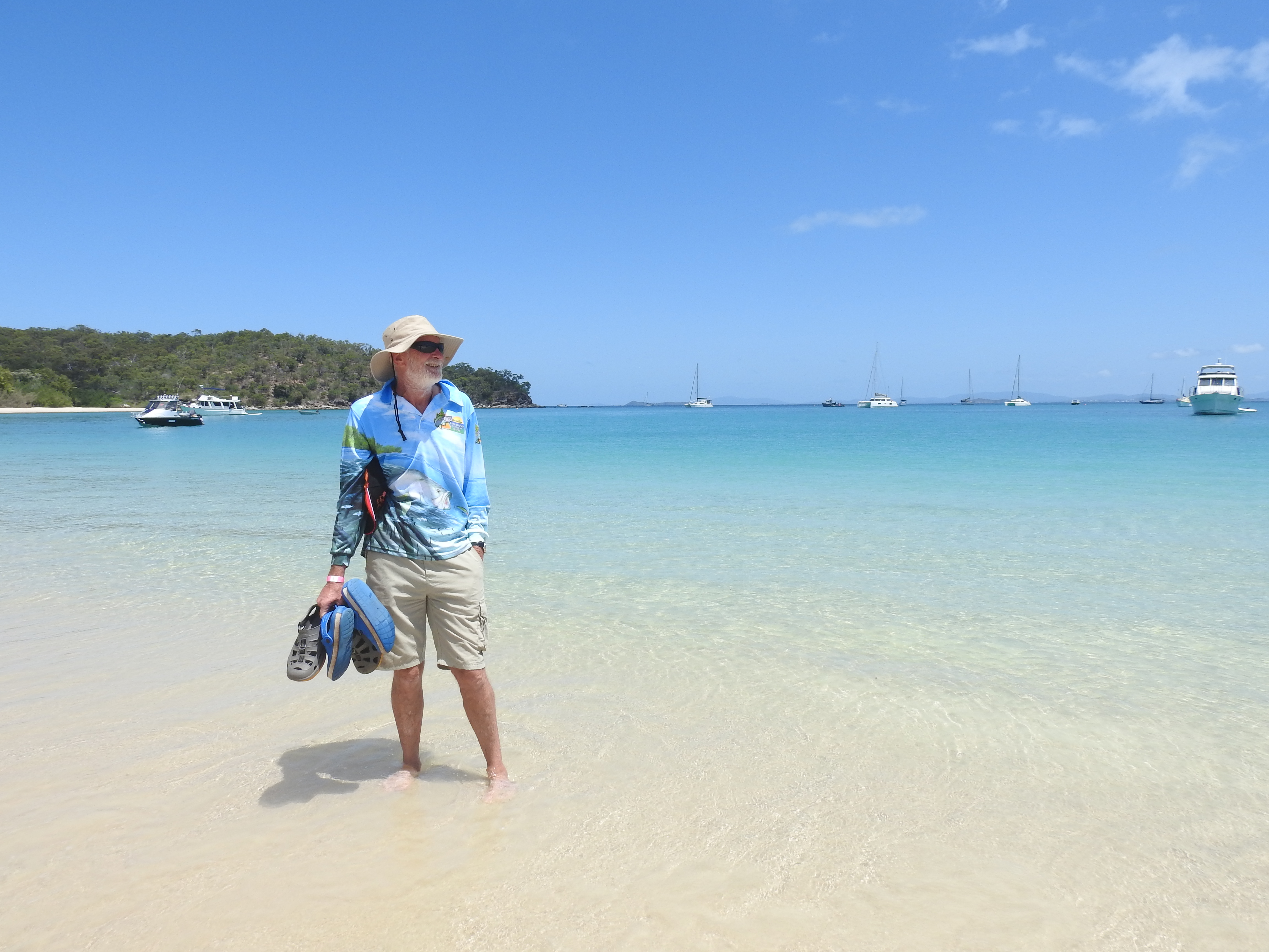 We board at 9am & the boat is reasonably full with a good mix of passenger types. The mix of boat types in the marina is very interesting, with many millions of dollars of boats on display. The big catamaran we are on is very comfortable & fast, we quickly leave the boat harbour behind & enjoy the scenery of receding spectacular headlands & small islands. We pass a number of sailing boats either heading out or coming in plus a few fishing boats as well. The trip to Great Keppel Island takes around 30 minutes & as we draw close we get to admire all the sailing boats at anchor in the lee of the island. Our boat noses into the sand then drops a ramp onto the sand so that most of the passengers can disembark, we stay on board, time for our morning tea.