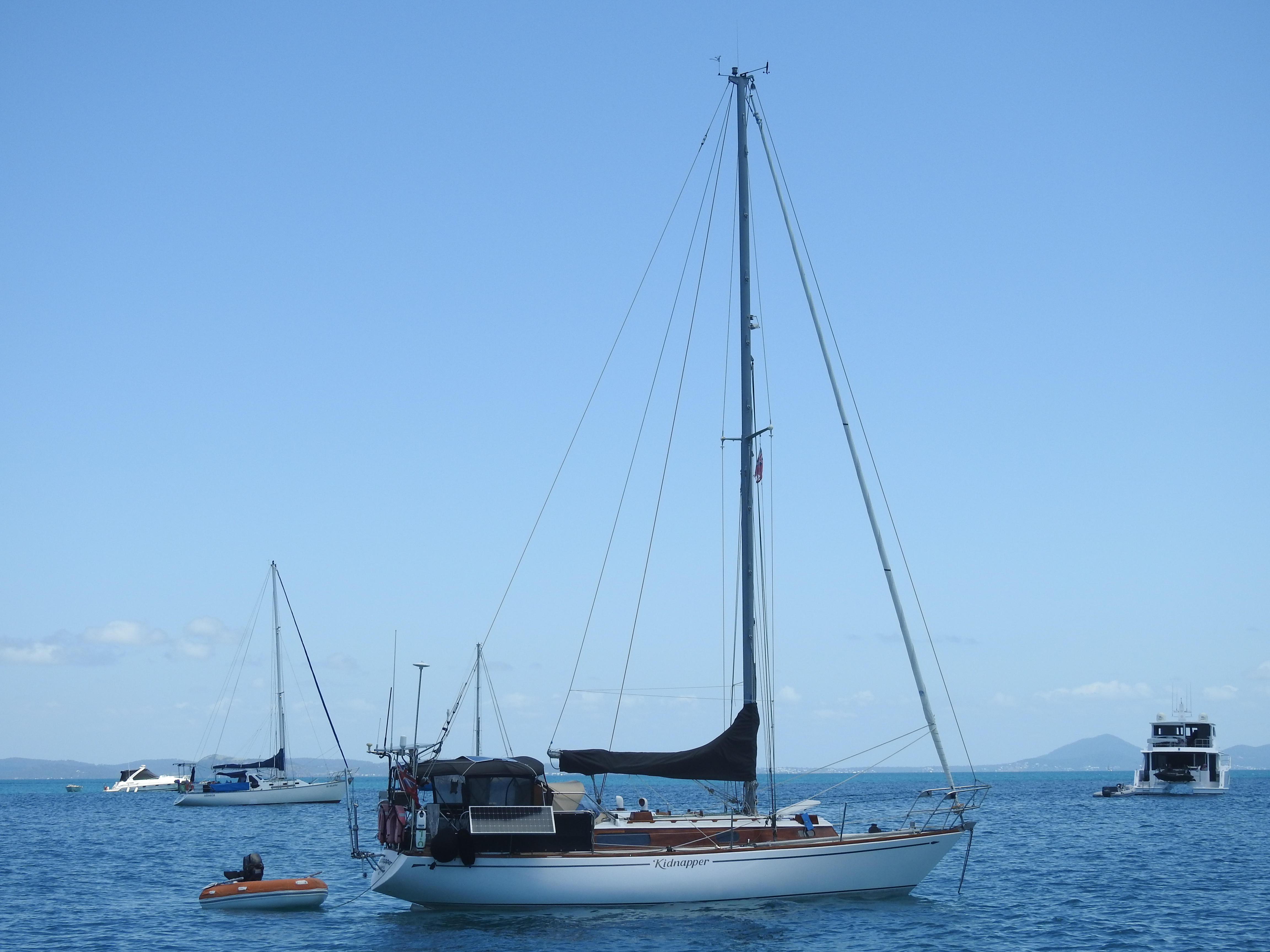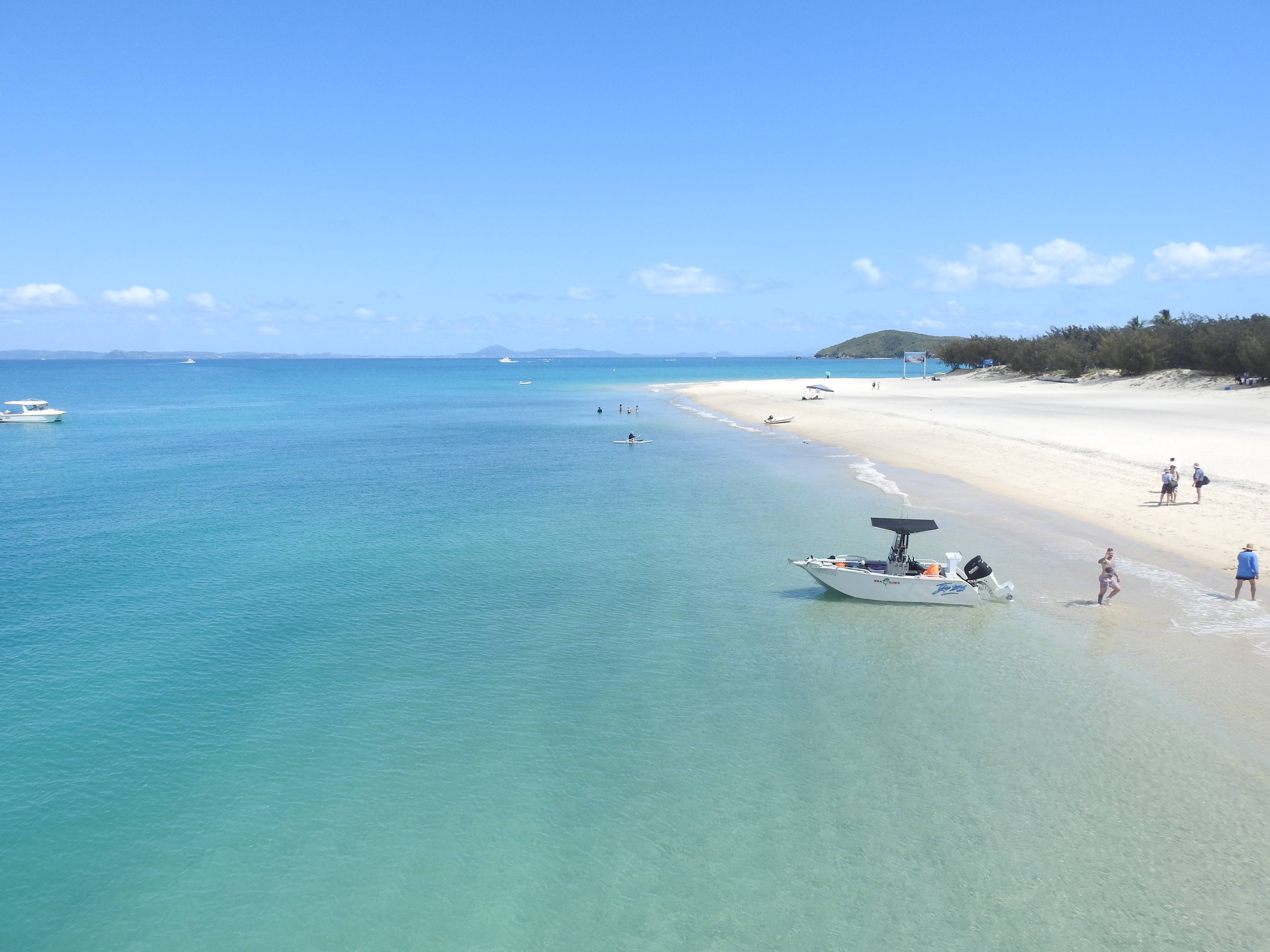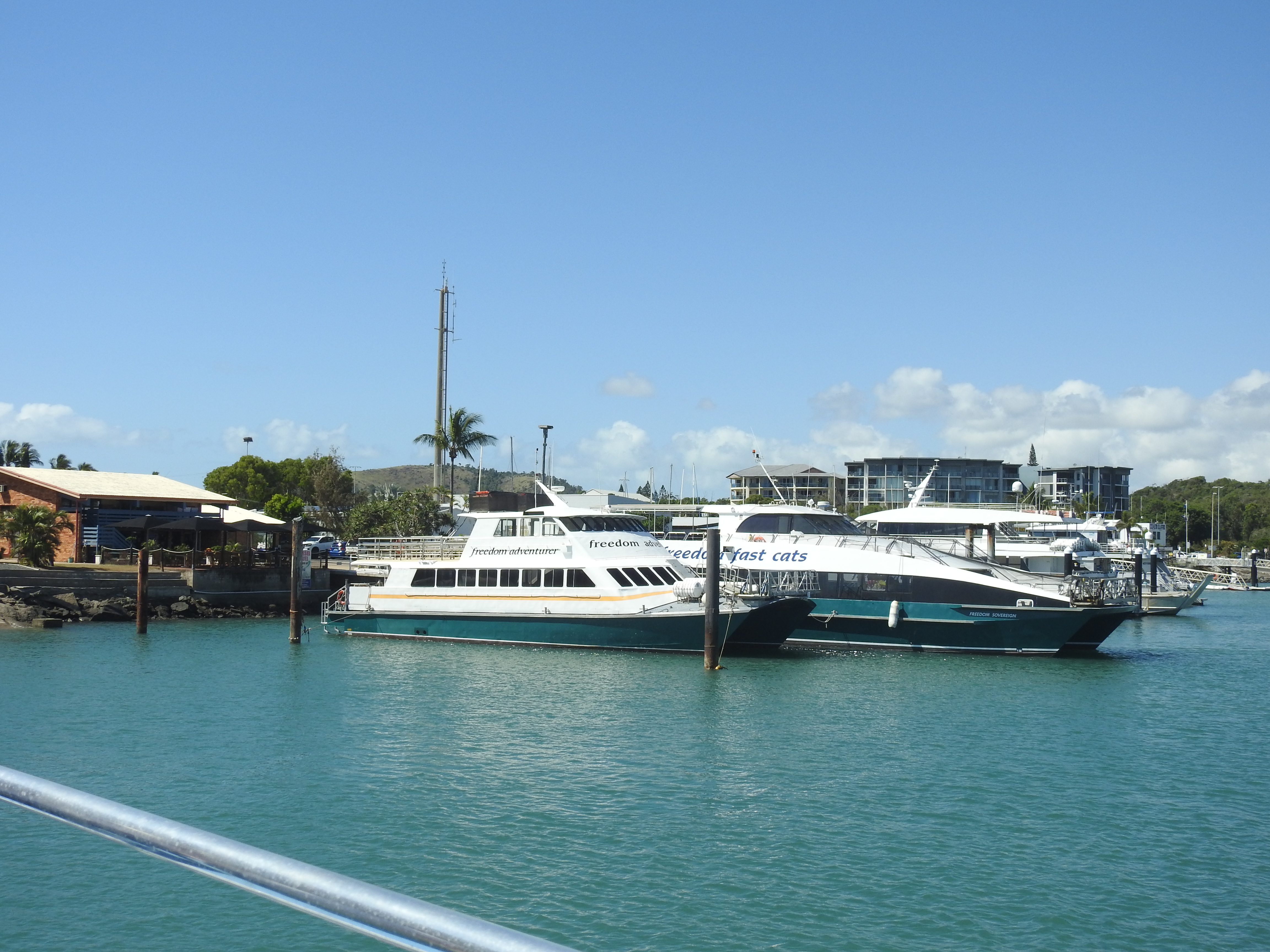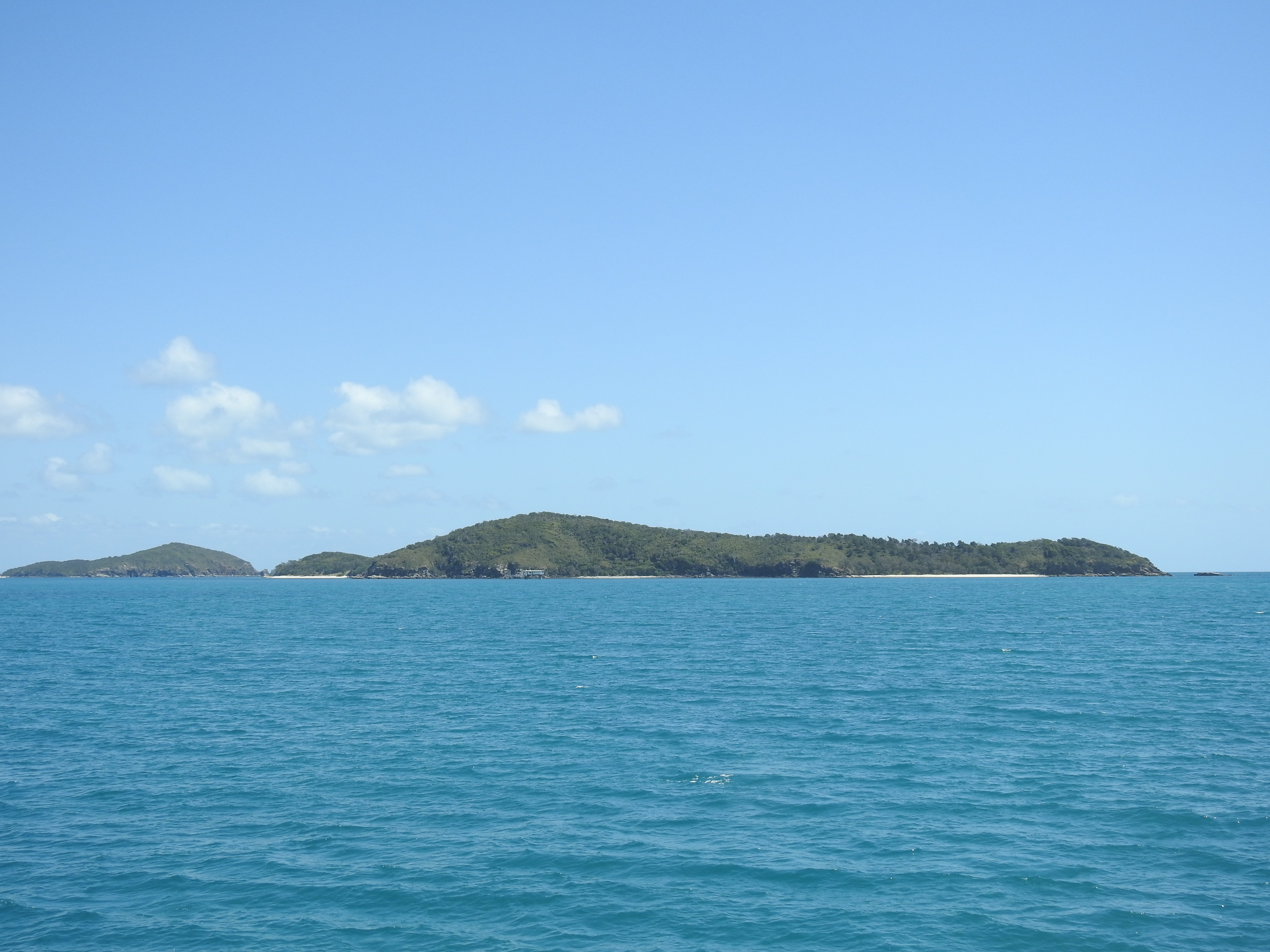 We board at 9am & the boat is reasonably full with a good mix of passenger types. The mix of boat types in the marina is very interesting, with many millions of dollars of boats on display. The big catamaran we are on is very comfortable & fast, we quickly leave the boat harbour behind & enjoy the scenery of receding spectacular headlands & small islands. We pass a number of sailing boats either heading out or coming in plus a few fishing boats as well. The trip to Great Keppel Island takes around 30 minutes & as we draw close we get to admire all the sailing boats at anchor in the lee of the island. Our boat noses into the sand then drops a ramp onto the sand so that most of the passengers can disembark, we stay on board, time for our morning tea.