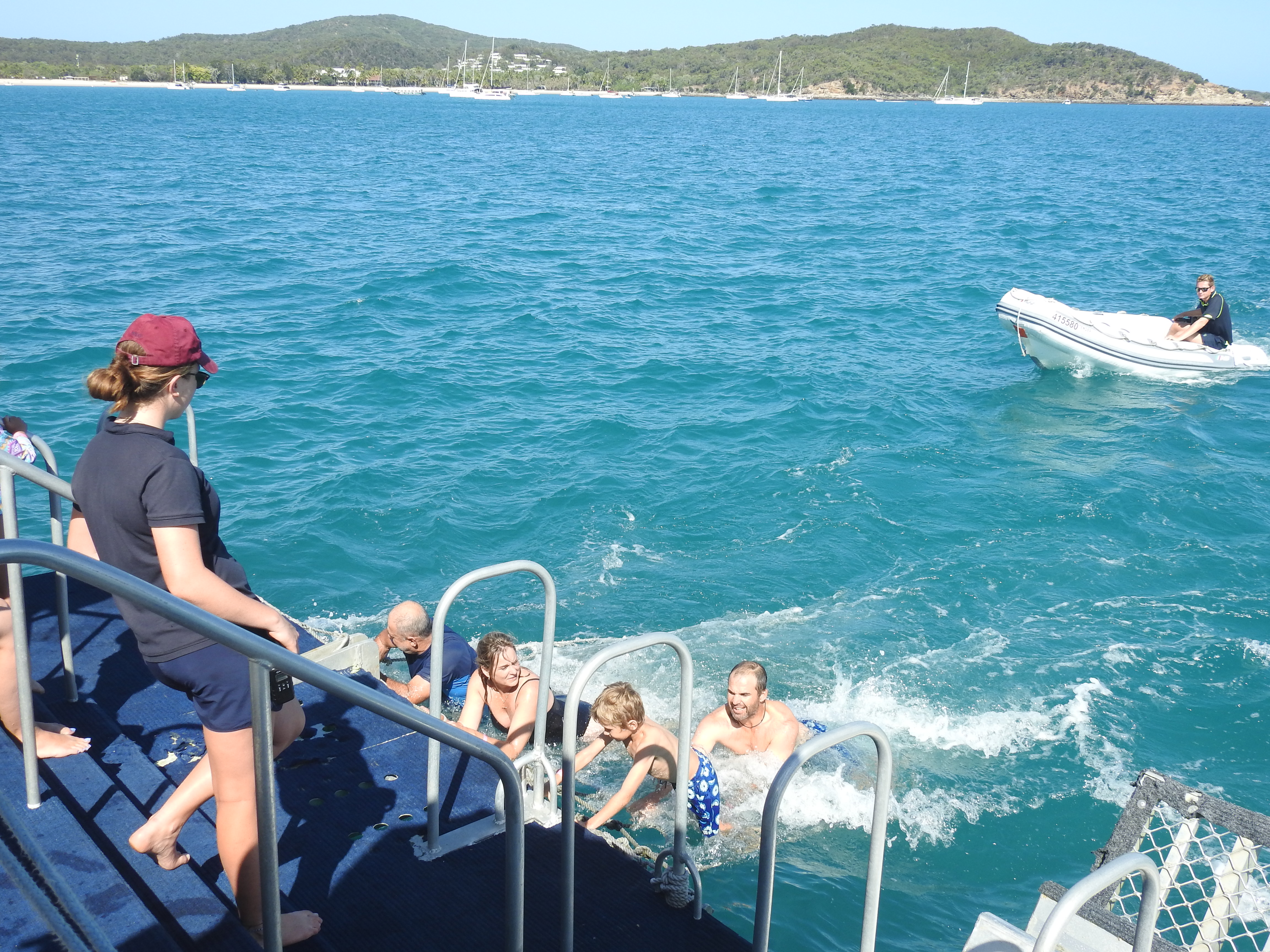 The snorkelling brief is very comprehensive before we are kitted out & enter the water. The boat has a very good swim platform off the back that is hydraulically operated. The water is a little cool at first at 23C, however we quickly get used to it as we swim over to the coral. We get a lot better view of all the different corals & multitudes of fish whilst snorkelling. We take our time & are continually amazed at the variety & colours of the fish. We see some very large fish & some really big schools of small colourful fish that we swim through. We spend over an hour in the water snorkelling the reef & are the last back onto the big boat. The crew are very efficient in helping us out & cleaning our gear. We dry off & change, then it is time for afternoon tea as we slowly motor back to the main beach.
