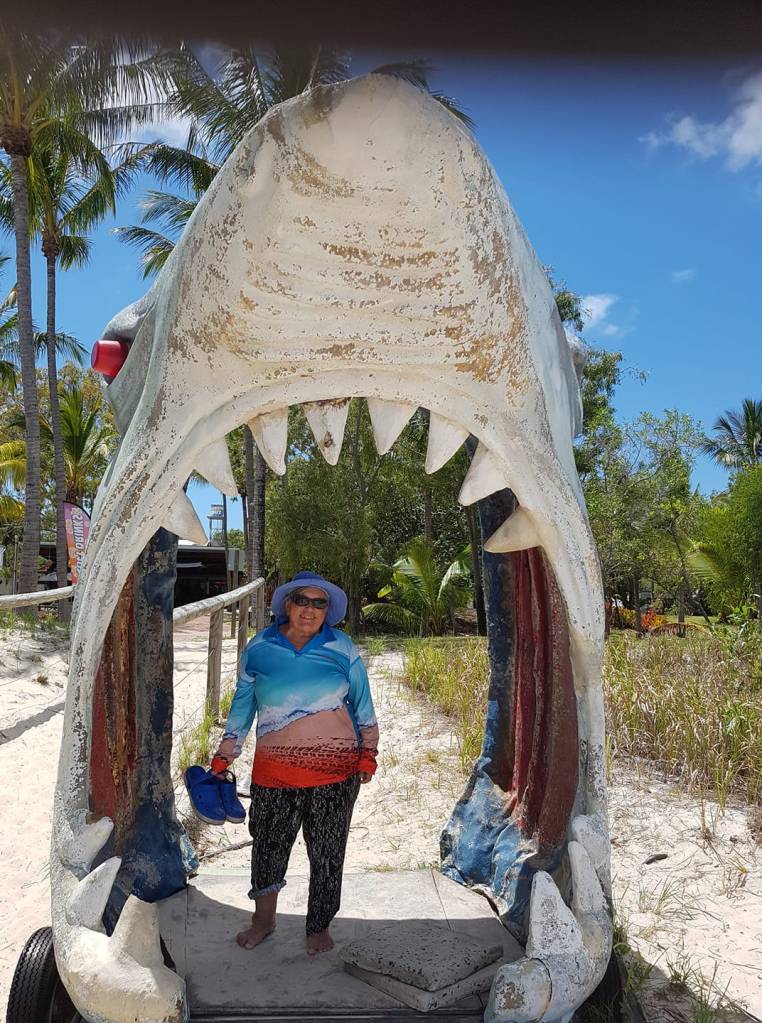 We walk up the beach & Tereza walks through the shark’s mouth, before we venture on to Tropical Vibes, a place recommended to us by friends. We do a little retail therapy & at the check-out we discover the girl serving is Hungarian. She has been in Australia 4 years & Tereza is the first person she has spoken Hungarian to in a very long time. It was a real surprise to her to hear someone talk Hungarian & she said she had to struggle to change her mind around to talk Hungarian, she has only been speaking English for so long. We walk along the promenade then onto the beach before walking along the beachfront in the water. The sand is so beautiful white & silky smooth. There are lots & lots of fish in the shallows. At 12.30 we board the big catamaran again & are served a nice lunch while we slowly motor over to our snorkelling spot at Monkey Bay. There is only about 15 of us, adults & kids now on the boat, nice for us, a small group. I am sure the cruise company would be happier with more people, things are tough because of the Covid lock down, tourists can’t come.